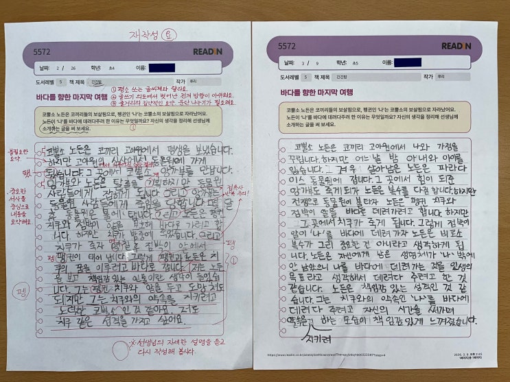 지승리드인은 단순히 책만 읽는 곳이라고 생각하시는 분들이 계십니다. 지승은 독서를 통해 생각을 키우고, 글쓰기를 통해 그 생각을 스스로 표현하는 힘을 기르는 곳입니다. 위 사진은 같은 학생이 처음 작성한 글(왼쪽)과 지도 후 다시 작성한 글(오른쪽)입니다. 처음 글에서는 이야기의 흐름이 정리되지 않았고 중요한 사건과 생각이 섞여 있으며 자신의 생각을 논리적으로 정리하는 데 어려움이 있었습니다. 하지만 수업을 통해 이야기의 순서를 정리하고 핵심 사건을 중심으로 내용을 구조화하며 자신의 생각을 문장으로 표현하는 방법을 배우면서 글이 크게 달라졌습니다. 두 번째 글에서는 사건의 흐름이 자연스럽고 자신의 생각과 이유가....... <img src="https://blogthumb.pstatic.net/MjAyNjAzMTZfMjQx/MDAxNzczNjM3OTI2MjQ3.xcn1CEtx2cUj6QQUSGM9tX8T-Sh1GI9oC49_-hzGGPAg.6ASSjPz3f2erbnAnmzVwN4h1-wMdDkG_AeV1k_l9Sd4g.JPEG/KakaoTalk_20260313_134919769.jpg?type=s3" />