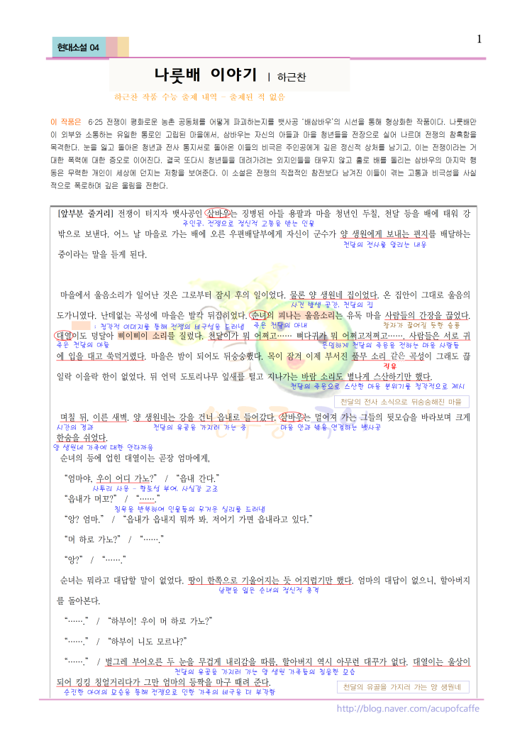 [의정부 국어학원] 2027학년도 수능특강 해설 - 완두콩 김두환 현대소설04 나룻배 이야기 | 하근찬 하근찬 작품 수능 출제 내역 – 출제된 적 없음 이 작품은 6·25 전쟁이 평화로운 농촌 공동체를 어떻게 파괴하는지를 뱃사공 ‘배삼바우’의 시선을 통해 형상화한 작품이다. 나룻배만이 외부와 소통하는 유일한 통로인 고립된 마을에서, 삼바우는 자신의 아들과 마을 청년들을 전장으로 실어 나르며 전쟁의 참혹함을 목격한다. 눈을 잃고 돌아온 청년과 전사 통지서로 돌아온 이들의 비극은 주인공에게 깊은 정신적 상처를 남기고, 이는 전쟁이라는 거대한 폭력에 대한 증오로 이어진다. 결국 또다시 청년들을 데려가려는 외지인들을 태우지 않....... <img src="https://blogthumb.pstatic.net/MjAyNjAzMTZfODAg/MDAxNzczNjQ3NDc0NzY3.k57vDCJw86ZBLDeNejQWjR8iA0Dk8HytAyJRRqj3xVkg.1FVLp2Gylr2l3pcmFMILGnuemenuUUkAb60tViddV1Eg.PNG/%C7%F6%B4%EB%BC%D2%BC%B304_%B3%AA%B7%ED%B9%E8_%C0%CC%BE%DF%B1%E2%28%C7%CF%B1%D9%C2%F9%29_%C7%D8%BC%B3_-_2027%C7%D0%B3%E2%B5%B5_%BC%F6%B4%C9%C6%AF%B0%AD001.png?type=s3" />