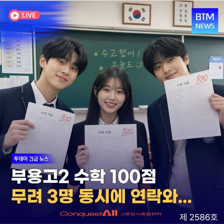 부용고 수학 100점, 이번엔 3명 동시에?! 안녕하세요? 경기 북부 입시총괄센터, 의정부 민락동 중등 영어, 수학, 국어, 과학학원 컨퀘스트올/버팀목 학원 티목이 언니예요^^ 여러분… 이거 진짜 속보예요. 방금 전에 너무 놀라서 손이 떨리는 상태로 글 쓰고 있어요 “선생님!! 수학 100점이에요!!!” 저번에 영석고 100점 소식 전해드린 거 기억하시죠? 그때도 정말 기뻤는데요… 이번에는 무려 3명이 동시에 수학 100점이라는 전화가 왔어요!!! 정말… 전화 받는데 “네?? 몇 명이요??” 이 말만 반복했네요 이번 주인공은 바로! ✔ 부용고등학교 2학년 김00 김00 손00 세 학생 모두 수학 100점 ?....... <img src="https://blogthumb.pstatic.net/MjAyNjA0MjlfMTgx/MDAxNzc3NDU1NjcxMDU5.fqvhTNp24Rr0VkjCfdO8D09wYo6EF1F_SwNsIBaj-Lkg.dC3pYgTbAxRSJiJC1N-pa5gEHw6ccxB_ZDdDaZFmVqMg.JPEG/%B9%F6%C6%C0%B8%F1_%BA%ED%B7%CE%B1%D7_%C0%CE%BD%BA%C5%B8_%281%29.jpg?type=s3" />