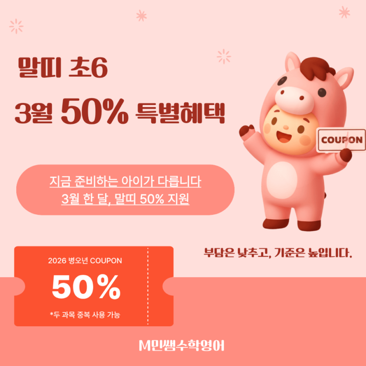 안녕하세요. 민쌤학원입니다❤ 2026년 병오년을 기념하여 초등 6학년을 대상으로 3월 50% 이벤트를 진행합니다~! **수학, 영어 두 과목 중복 적용 가능합니다. 상담문의: 010 - 8074 - 2031 <img src="https://blogthumb.pstatic.net/MjAyNjAyMjRfMzQg/MDAxNzcxOTAzNjUxNzE3.7QO9yLPakOM50Y7BdzQSA8H3myffg77sNhvLZshmDcwg.Gt5FGFPg-pvYIcGdFqiSoIqtzzJqEfa-u5RtLu5MttQg.PNG/IMG%A3%DF3495.PNG?type=s3" />
