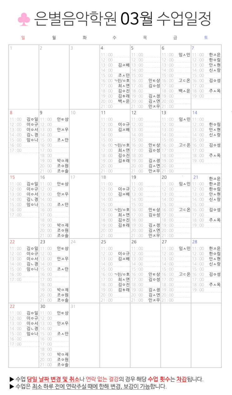 은별음악학원 3월 수업일정