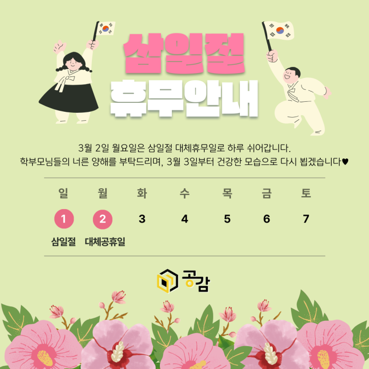 신곡동수학학원 공감수학금오에서 알려드리는 3월 수업 일정! 안녕하세요, 공감쌤입니다. 오늘은 3월 수업 일정을 알려드리려고 해요. 3월 1일 일요일은 삼일절로, 3월 2일은 삼일절 대체공휴일입니다. 이에 월요일 하루는 쉬어가려고 하는데요! 이날 하루는 수업 및 상담이 어려우니 학부모님들의 너른 양해를 부탁드립니다♥ 3월 3일부터는 학교 개학과 함께 신곡동수학학원 공감수학금오도 정상 수업을 운영하는데요! 개학으로 인해 시간표 변동이 필요하다면 개별적으로 학원에 문의해주시면 됩니다. 학기중에는 방학과는 또 다른 학습 관리가 필요하죠. 학교 수업을 원만히 따라갈 수 있도록 앞단원에서 잊은 내용을 복습하고, 단원평가나 수....... <img src="https://blogthumb.pstatic.net/MjAyNjAyMjZfMTA2/MDAxNzcyMDc4NzM2OTE1.eenOtnjMiRiYzHbVkAe0qUIx8PtetbwXUFaOeU-XMYYg.qsN8I1u0_gyra2PpQqjR9WZe_dj8gMXHPGw3ggw3jP0g.PNG/%BB%EF%C0%CF%C0%FD.png?type=s3" />