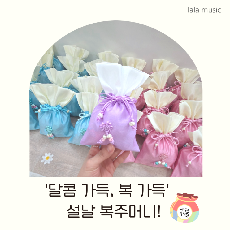 안녕하세요! 라라음악학원입니다 어느덧 우리 명절인 설날이 다가왔습니다 이번 설날 연휴는 밸런타인데이와 겹쳐 우리 소중한 아이들에게 어떤 특별한 추억을 선물할까 고민하다가 특별하게 초콜릿과 약과를 가득 담은 달콤함 가득, 복 가득한 '복주머니'를 준비해 보았어요! 파스텔톤의 화사한 복주머니에 우리 아이들이 좋아하는 초콜릿과 명절인 만큼 전통 약과를 우리 아이들이 올 한 해 건강하고 행복한 일들만 가득하기를 바라는 마음으로 듬뿍 담았답니다❤ 복주머니를 받아 들고 '새해 복 많이 받으세요!'라고 웃으며 인사하는 라라둥이들이 사랑스럽고 너무 귀여웠답니다 설날 연휴에는 라라 음악도 잠....... <img src="https://blogthumb.pstatic.net/MjAyNjAyMTdfMjQy/MDAxNzcxMzE5NzU3NDEx.xzG2exei7D7RSz39lLv7SGbBUCeQ1HGvGm6_u7pWOhYg.BDfgDfQnd3M9Mhe2ONWOu4dtkKZb5RLe5GsaW_io7Zsg.PNG/%C1%A6%B8%F1%C0%BB-%C0%D4%B7%C2%C7%D8%C1%D6%BC%BC%BF%E4_-014.png?type=s3" />