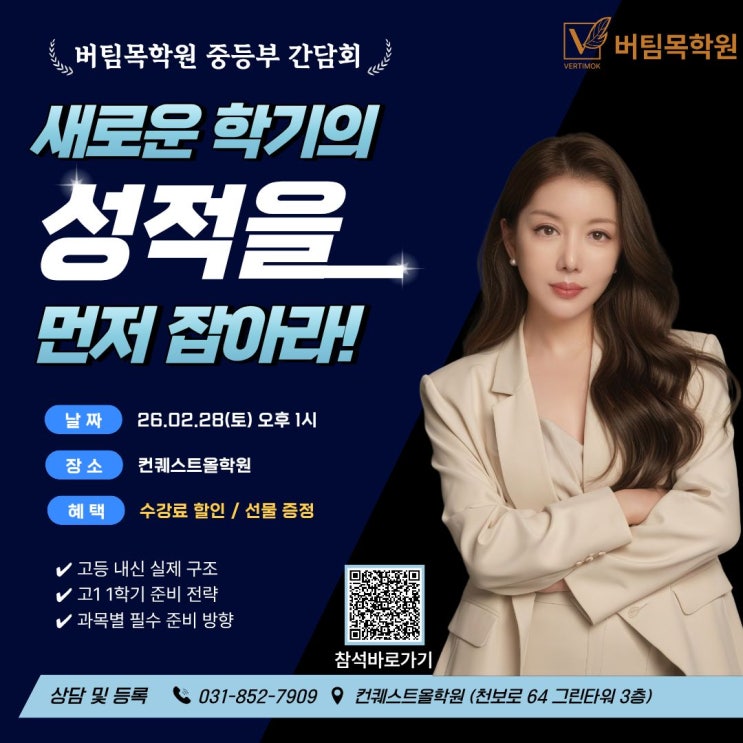 고1 1학기 무너지기 전, 반드시 들어야 할 간담회 안녕하세요? 경기 북부 입시총괄센터, 의정부 민락동 중등 영어, 수학, 국어, 과학학원 컨퀘스트올/버팀목 학원 티목이 언니예요^^ 요즘 상담을 하다 보면 이런 말씀을 정말 많이 들어요. “우리 아이는 아직 괜찮겠지요?” “중학교 성적은 잘 나오니까 괜찮지 않을까요?” 그런데, 이 생각이 고1 1학기 성적표 앞에서 무너지는 경우를 정말 많이 봤어요. 중학교 3년이 고등학교를 결정해요 고등학교는 갑자기 어려워지는 곳이 아니에요. 중학교 때 잘못 잡힌 공부 습관이 고등학교에서 그대로 드러나는 구조예요. ✔ 개념은 얕은데 문제만 많이 푼 경우 ✔ 암기로 점수는 나왔지만 사....... <img src="https://blogthumb.pstatic.net/MjAyNjAyMjBfMTk0/MDAxNzcxNTcyNDIyOTA5.p8e5eQ8dmDzLWKtT4wTFKsiPGNzhagXR_y94MXH6bcgg.VXtXS_E1EQVLG4gdDODHzjVxV1u2nqsOgYq2z0vnXcgg.JPEG/%B9%F6%C6%C0%B8%F1_%BA%ED%B7%CE%B1%D7_%C0%CE%BD%BA%C5%B8_%283%29.jpg?type=s3" />