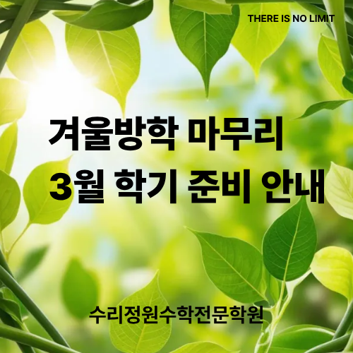 안녕하세요, 수리정원입니다. 겨울방학도 이제 일주일 정도 남았습니다. 곧 3월의 시작과 함께 새로운 학기가 시작됩니다. 고3 학생들은 겨울방학 동안 확률과 통계, 미적분 마무리를 중심으로 내신 준비와 수능 준비를 함께 이어오고 있습니다. 마지막까지 흐름을 놓치지 않고 차분하게 정리하는 데 집중하고 있습니다. 다른 학년 학생들도 방학 특강으로 평소보다 늘어난 학습 시간 속에서 쉽지 않은 일정이었지만 끝까지 성실하게 잘 따라와 주었습니다. 남은 방학 기간은 새로운 진도를 급하게 나가기보다 지금까지 배운 내용을 정리하고 부족했던 부분을 보완하는 데 집중할 예정입니다. 특히 이번 주는 빠진 개념과 취약 단원 보충을 위한....... <img src="https://blogthumb.pstatic.net/MjAyNjAyMjNfMjAz/MDAxNzcxNzg2MDkxNjUz.A4kVX2Oglz-oTYaJxJ7015qg4yfS5W1hYEbO5V8Hkukg.yJ0tls5eZnmj_gwQoti-sWpmrF8FV86wt141Btf8mlcg.PNG/%C1%A6%B8%F1%C0%BB_%C0%D4%B7%C2%C7%D8%C1%D6%BC%BC%BF%E4._%2884%29.png?type=s3" />