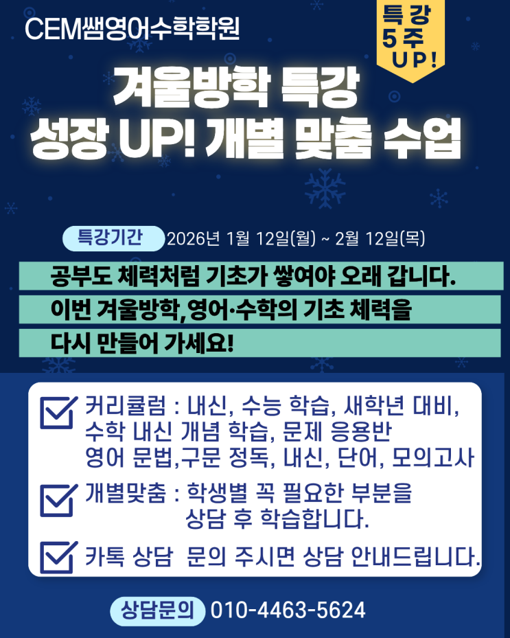 겨울방학은 아이들의 공부 흐름을 다시 정리하고 기초를 차분히 다질 수 있는 가장 중요한 시간입니다. 학기 중에는 학교 일정, 수행평가, 시험 준비로 놓치고 지나간 부분들이 생기기 마련입니다. 그래서 방학은 ‘더 앞서 가기’보다 기초를 정확히 다지는 시간이어야 한다고 생각합니다. 쌤CEM 영어·수학학원은 아이 한 명, 한 명의 수준과 학습 상태를 살피며 개인별 맞춤 수업과 꼼꼼한 학습 관리로 아이들의 공부 흐름을 함께 만들어가고 있습니다. 이런 아이들에게 특히 추천드립니다 영어·수학 기초가 불안한 아이 학원은 다니고 있지만 성적 변화가 크지 않은 아이 새 학년을 앞두고 개념이해가 필요한 아이 혼자 공부하기 어려워 관리....... <img src="https://blogthumb.pstatic.net/MjAyNjAxMDlfMTAw/MDAxNzY3OTY1NDYzMjA2.BA2wM1UBHEqgXqylQnyTrhaTG80oFUi5OI-b4R0c2Zgg.aQ0Ugj-YdORu7paifTTDulOP_o14QfwvVxWENOmU7O0g.PNG/%C1%A6%B8%F1%C0%BB_%C0%D4%B7%C2%C7%D8%C1%D6%BC%BC%BF%E4._%2813%29.png?type=s3" />