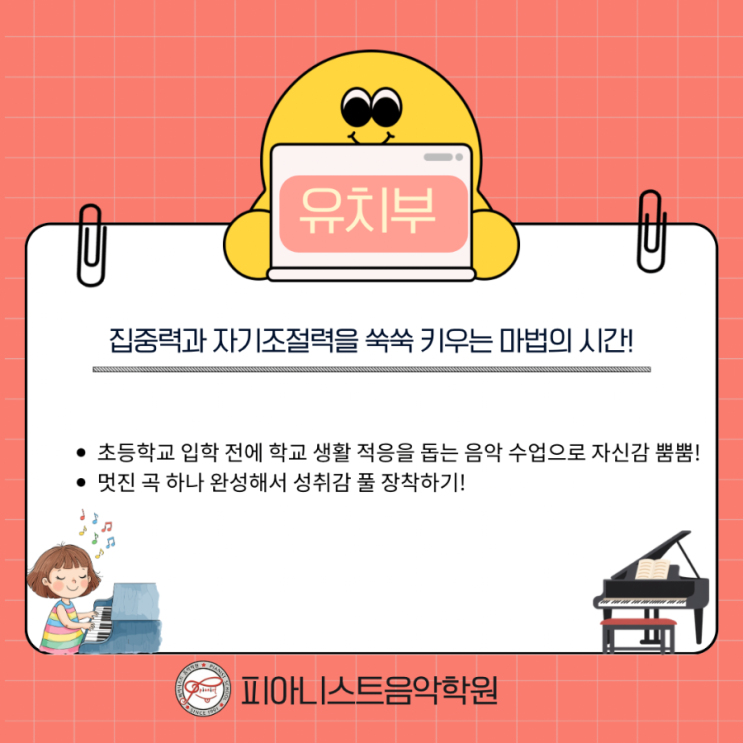 유치부 모집 건반보다 의자가 더 크고, 손보다 음표가 먼저 반짝이는 시기 ✨ 피아노는 ‘잘 치는 것’보다 음악을 좋아하게 만드는 게 먼저입니다. 놀이처럼 배우며 리듬·집중력·감각을 자연스럽게 키우는 시간 2026 피아니스트 음악학원 유치부 원아 모집 ✔ 1:1 맞춤 레슨 ✔ 놀이+기초 병행 수업 ✔ 첫 음악수업 전문 커리큘럼 아이의 첫 음악 친구, 피아니스트 음악학원에서 시작하세요 #유치부피아노 #유아피아노 #5세피아노 #6세피아노 #7세피아노 #유아음악교육 #유아예체능 #첫피아노 #첫음악수업 #놀이피아노 #감각발달 #집중력향상 #두뇌발달 #피아노학원추천 #동네피아노학원 #피아니스트음악학원 #원아모집 #신....... <img src="https://blogthumb.pstatic.net/MjAyNjAxMjJfMTE4/MDAxNzY5MDg3OTUyNzI5.Dwp6M4nwdDnAz9MquA0TlHe0pFX5Xuesi97ETgw662Yg.x8Ihdyry37_8wEeH1KOgjlg5ETsGldkdT2AXqEbvJ7Mg.PNG/900%A3%DF1769004620537.png?type=s3" />