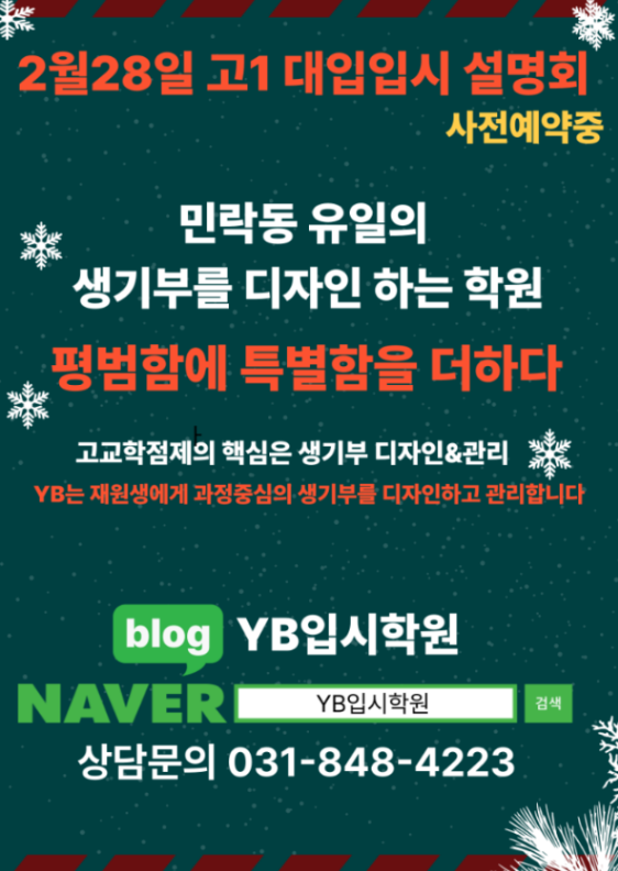 안녕하세요 YB학원입니다 고교학점제에서는 이전보다 생기부를 관리하는 것이 중요하다는 것은 이미 많은 분들이 알고 계십니다 어떻게 생기부를 작성해야 하나? 어떻게 생기부에 전공적합성을 드러나게 해야 하나? 어느학원이 이런 생기부를 디자인하고 관리하나? 내 생기부는 좋은 생기부인가? 등등 궁금하신 내용이 많죠??? 인터넷을 검색하더라도 너무 어렵고 어떻게 하라는 건지 뜬구름 잡는 소리인거 같고....... 이제 걱정하지 마세요 YB학원이 해결해드리겠습니다 구체적이고 친절하며 학생 개별개별 디테일한 생기부 상담을 진행해드립니다 먼저 전화를 주시고 입시 설명회에 참석만 하시면 어떤 부모님도 어떤 학생이더라도 저희가 해....... <img src="https://blogthumb.pstatic.net/MjAyNjAxMjJfNjgg/MDAxNzY5MDQ3MDUxOTUw.epg4u8xwBvBcb6aQmU2-xESrLFgd48aVv1kdY6cm72gg.gGWV3_aoUfmAzQzO__VR53DOBmdqFRrxZnVFg7vokCkg.PNG/image.png?type=s3" />