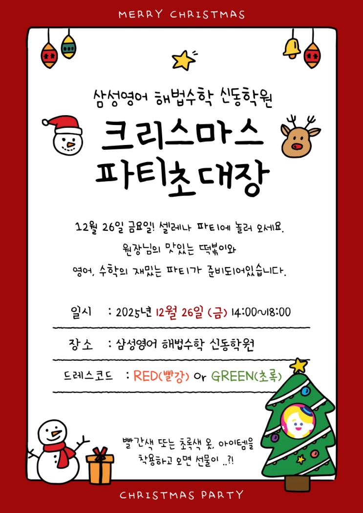 안녕하세요 삼성영어셀레나 해법수학 신동학원입니다! 지난 크리스마스 저희 학원에서 일년동안 고생한 우리 아이들을 위한 파티를 진행했습니다!❤️ 파티 전에 모두에게 공유된 파티 초대장입니다! 드레스코드는 빨강 또는 초록으로 우리 아이들의 센스있는 착장을 보는 재미도 있었답니다. 우선 학원에 들어오면 보이는 포토존과 보드게임존입니다! 아이들이 귀여운 크리스마스 모자를 쓰고 친구들과 함께 모두 사진을 찍고 갔습니다. 짜잔! 다들 너무 귀엽죠 ㅎㅎ 영어교실에서는 영어쌤과 함께 재밌는 퀴즈게임을 했습니다. 셀레나와 관련된 퀴즈를 맞추고 크리스마스 선물을 각자 받아갔습니다!❤️ 퀴즈게임을 한 모든 아이들은 떡볶이 쿠....... <img src="https://blogthumb.pstatic.net/MjAyNjAxMDlfMjU4/MDAxNzY3OTY2NTM4MDQ5.sSOTtazCkNHdHn1hM2CzVn8uGKce-R_1z-fdJc-xq7Yg.XGatIYd492ZY84CpDTtBzI9aSU2MjkacZquuG2M-6bsg.PNG/IMG%A3%DF6109.PNG?type=s3" />