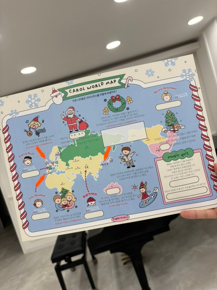 오늘의 특강수업은 바로! 곧 돌아오는 크리스마스에 대한 특강이랍니다 아이들이 가장 기다리는 날중 하나이기도 하죠 ㅎㅎ 오늘 특강의 내용은 크리스마스 캐롤에 관한 수업이랍니다^^ 지도를 보며 각 나라의 크리스마스 인사말도 배워보고, 각 나라의 크리스마스 문화에 대해 알아보는 시간 이었답니다 만들기 수업은 너무나 예쁜 스노우볼 만들기☃️ 스노우볼 만들기 전 각자 생각하는 스노우볼 안 세상을 그려보았어요~! 예쁜 스노우볼도 완성 저도 하나 만들어보았는데 너무예쁘죠 다가 올 크리스마스를 기대하며 아이들 모두 즐겁게 그려보고, 만들어 본 예쁜 스노우 볼이랍니다. 다음 포스팅은 아이들의 크리스마스....... <img src="https://blogthumb.pstatic.net/MjAyNTExMjZfMTYy/MDAxNzY0MTQ3MDM0Mjkx.rIjuqhUe-5DktCy70HJYQz8XvbsFrcGh6dJIQH80bgAg.j4kPRh8Vfq8SCBEN3Vy5_UlKr49B9YUxz0A9TMCy7kMg.JPEG/IMG%A3%DF4420.jpg?type=s3" />