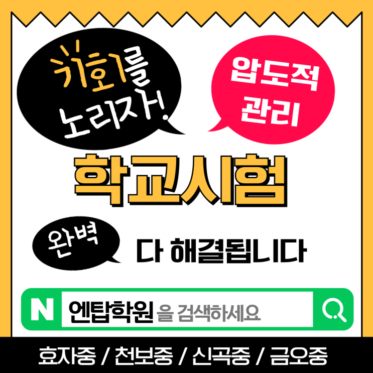효자중 천보중 신곡중 금오중 학교시험을 '제대로' 준비하는 학원은 다릅니다 중학교 시험은 단순히 문제를 많이 푼다고해서 좋은 결과가 나오지 않습니다. 같은 중학교시험이라도 학교마다 출제방향과 난이도, 문제유형이 다르고 같은 학교안에서도 아이들마다 이해속도와 기초수준은 전혀 다르기 때문입니다. 압도적인 시험준비 이제는 학교시험, 내신대비 걱정 끝!! 엔탑학원에서 제대로 공부하고 준비해요! 학교마다, 시험마다 모든 학교시험을 책임지고 지도해요. 수행평가, 단원평가 중간고사, 기말고사 등등 모든 시험은 엔탑학원에서 책임지고 지도합니다. 기초가 부족해도 걱정 NO 지금부터 시작해요! 아이마다 맞춘 개별진도....... <img src="https://blogthumb.pstatic.net/MjAyNTEyMTRfOTUg/MDAxNzY1Njc2MjQ1MzIy.fz6YOrR2Vk0lLoOZUfWaAXiMsruCTgs6yErkgfET0l8g.CDhIJ5j8syzT1DY_i9ywx6orGTaSI8k9nQfC26XYd9Mg.PNG/001.png?type=s3" />