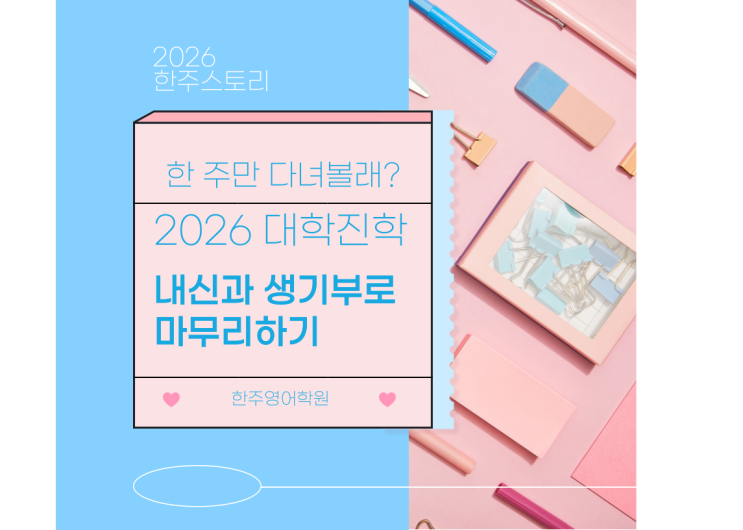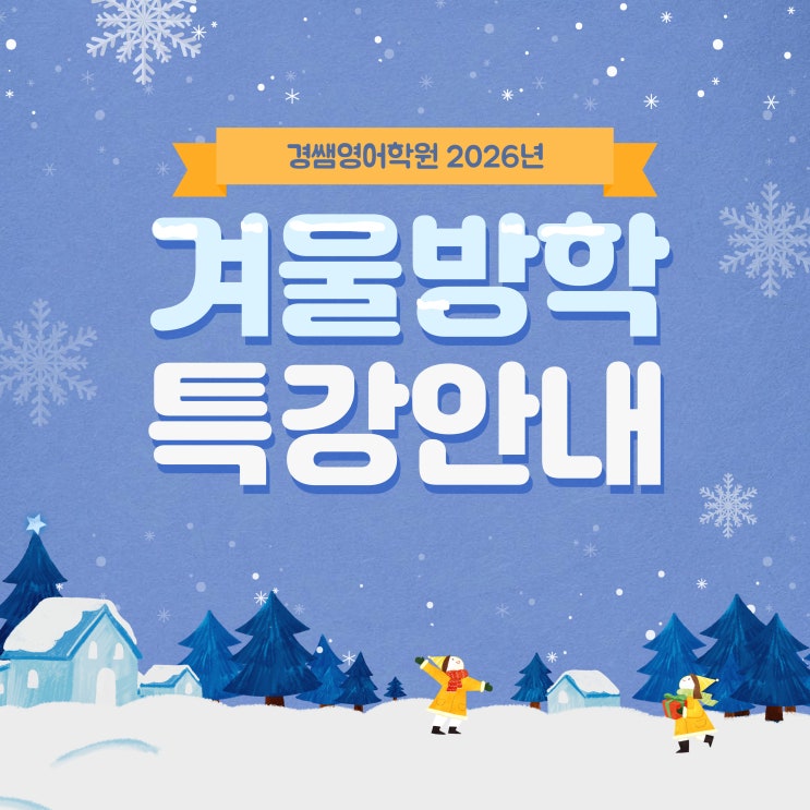 안녕하세요~ 경쌤영어입니다. 다가오는 겨울방학을 맞아 학생들의 영어 실력 도약을 위한 2026년 겨울방학 특강을 개설합니다. 겨울방학은 ✔ 지난 학기 내용을 정리하고 ✔ 다음 학기·다음 학년을 미리 준비할 수 있는 가장 중요한 시기입니다. 경쌤영어 겨울방학 특강은 문법 중심의 체계적인 선행학습으로 초등부터 고등까지 학년별 맞춤 수업으로 진행됩니다. 겨울방학 특강 공통 안내 특강 신청 기간 : 2025.12.30 ~ 2026.01.09 수업 횟수 : 총 8회 (초등 1회 70분, 중·고등 1회 90분) 특강 요일 : 주 4회 (화 · 수 · 목 · 금) 특강 기간 : 2026.01.20 ~ 02.06 (보강주 포함) ※ 보강은 학생들과 시간을 조율하여 진행됩니다. 초....... <img src="https://blogthumb.pstatic.net/MjAyNTEyMjZfMTIy/MDAxNzY2NzMwNDkyNDQ5.fZavMmj4oem_1Ngh_Xf5hhnrQwf4gas3DZAzihcSI-cg.7ZuGoAUAr9OvohzSL7rmZVvJe1Ou76ulfGPMEyx0H2og.JPEG/%B0%DC%BF%EF%B9%E6%C7%D0_%C6%AF%B0%AD%BE%C8%B3%BB_%281%29.jpg?type=s3" />