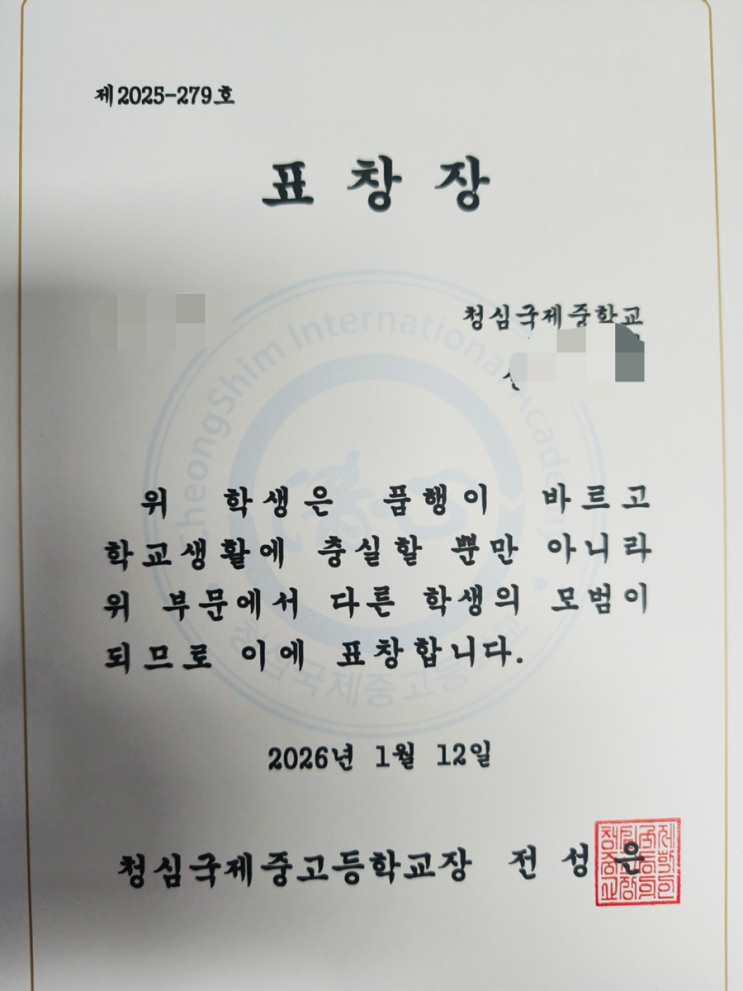 오랜만에 포스팅 합니다. 그 동안 티칭하면서 2025년은 너무 바쁜 한해이였어요. 감사하게도 많은 학부모님들이 귀한 자녀들을 보내주시고 오랜기간 동안 믿고 보내주시고 소개도 많이 해주셔서 2025년은 꽉찬 한 해를 보냈습니다. 정말 감사드립니다. 블로그를 그 동안 할 시간이 없었는데 겨울방학이 되니 이제서야 시간이 좀 나서 오랜만에 들러봅니다. 언어, 글로벌 역량을 키우고 싶은 어머님들이 가장 궁금해 하는 학교 ☑️청심국제중 어느덧 학년이 종료될 시점이 되었네요 1년동안 무탈하게 학교생활 했어요 학년전체에서 하나 밖에 없다는 상도 타오고 표창장이라니.. 상 내용도 기특합니다. 또, 1학기에는 기숙사에서 전체 8명에게 주....... <img src="https://blogthumb.pstatic.net/MjAyNjAxMDRfMjEw/MDAxNzY3NTM2ODkwMTk2.xwAQFux3HdiYT9cieHsjPHQW7D0mWWJi5CfpNychhdkg.B_FU9MjEqn1H8txhIRvbiCRD7SOh3F9n0PUZNrEf7Qgg.PNG/IMG%A3%DF6125.PNG?type=s3" />