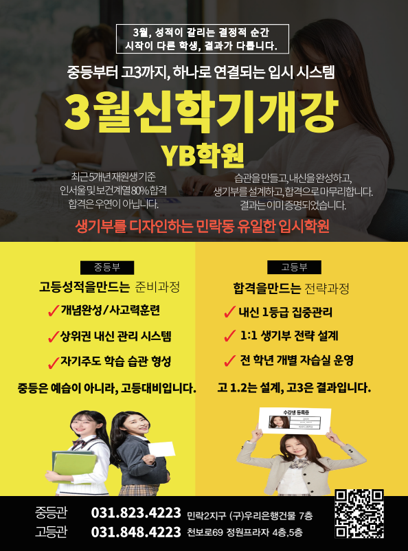 “한 장의 생기부가 완성되기까지” 한 장의 생기부는 하루 만에 완성되지 않습니다. 수업 시간의 태도, 내신 한 문제, 한 번의 발표, 작은 활동 하나까지. 모든 선택이 쌓여 결과가 됩니다. 그래서 우리는 중등부터 방향을 잡습니다. 고등에 올라가서 준비하는 것이 아니라 고등을 대비하며 중등을 보냅니다. 내신 1등급 관리, 1:1 생기부 전략 설계, 전 학년 개별 자습실 운영. 외부에 맡기지 않습니다. 내신, 수능, 컨설팅, 면접까지 ALL-IN-ONE으로 관리합니다. 3월, 시작이 다른 학생은 결과가 다릅니다. 2026 입시결과로 증명하는 YB입시학원 신학기 오늘부터는 27학년 대학별 수시&정시 전형을 분석하도록 하겠습니다 학교별로 제공하....... <img src="https://blogthumb.pstatic.net/MjAyNjAzMDRfNTIg/MDAxNzcyNjI2MjA3NTUw.ZAk-oq7gZiz7TLP71rlFcmdh60ZGykKD8Zw3mbZtIIsg.olVbQpceT5Usk5IqhMGy9XFyIFrkOAwE2recnFuuvbIg.PNG/image.png?type=s3" />