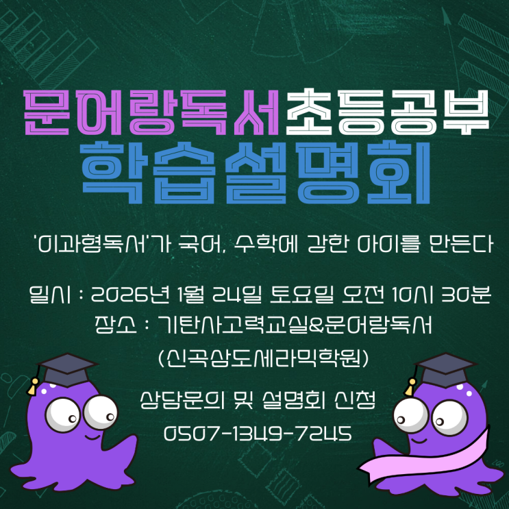 안녕하세요? 문어랑독서 의정부신곡센터입니다. 우리 아이들 문해력과 함께 수해력에 대한 관심도가 많이 높아지고 있지요? 문해력이 좋아야 수해력도 좋아집니다. 이과형 독서가 국어, 수학에 강한 아이를 만듭니다. 이과형독서가 궁금하시다면? 문어랑독서가 궁금하시다면? 공부를 잘하는 아이로 만들고 싶으시다면? 문어랑독서 의정부신곡센터의 수해력학습설명회에 참여 해 보세요. 경기교육청신고 2592호 교육비 188000원 문어랑독서 주 1회 90분 82000원 *교재비별도* #신곡2동국어학원 #신곡2동문어랑독서 #의정부문어랑독서 #신곡2동초등학원 #신곡2동논술학원 #문어랑독서 #초등공부 #문해력 #어휘력 #자기주도학습 #국어교육 #학습코칭....... <img src="https://blogthumb.pstatic.net/MjAyNTEyMjlfMTE4/MDAxNzY3MDExNzEwMDQw.dePpo-X_FjzMbHRuIMvG173qqowg7hQ9WRwlm-AkWlUg.AKXi95IL6WouqQhDEbrkAhLqgq5psEmTgdkNh2Mrl4Mg.PNG/%B9%AE%BE%EE%B6%FB%BC%B3%B8%ED%C8%B8.png?type=s3" />