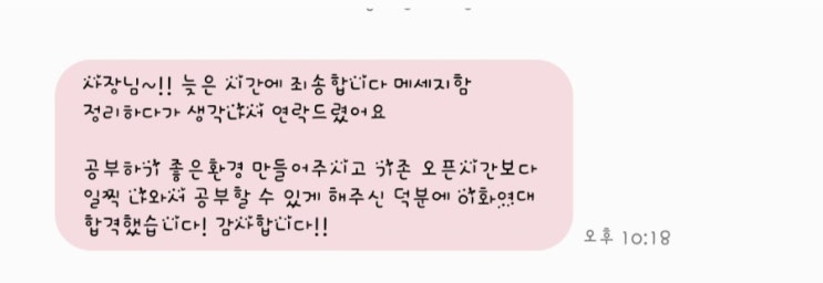 열심히 공부 하신 저희 회원님 이화여대 합격!! 너무 너무 축하드립니다^^ 저희 독서실은 조용한 환경 속에 총무가 상주해 있기 때문에 관리가 되는 독서실 입니다^^ 언제든지 오셔셔 공부하시고 좋은 소식들 전해듣는 그날까지 쭉 달리겠습니다^^ <img src="https://blogthumb.pstatic.net/MjAyNjAyMDlfMjY4/MDAxNzcwNTk2NzkzMzU1.gAsZo6csxWuEC6oyyOtMNvNZrCW9SZ1J_Sfrrx5k5Hgg.PVbRlhmo1TjiESHeHJ-aBsgxgGv_HpVg6Vc36-Z2hJgg.JPEG/Screenshot%A3%DF20260207%A3%DF222307%A3%DFMessages%A3%A82%A3%A9.jpg?type=s3" />