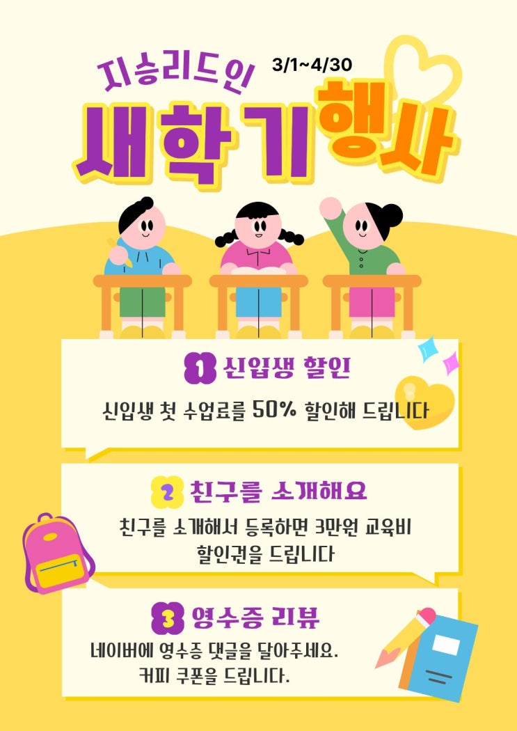 새학기를 맞아 우리 학원에서 특별한 혜택을 준비했습니다. 처음 등록하는 신입생에게는 첫 수업료를 50% 할인해 드립니다. 새로운 시작이 부담되지 않도록 응원하는 마음을 담았습니다. 또한 친구를 소개해 주시면 수업료 3만원 할인 혜택을 드립니다. 좋은 공부는 좋은 친구와 함께할 때 더 큰 힘이 됩니다. 마지막으로 네이버 영수증 리뷰를 작성해 주시면 감사의 마음으로 커피 쿠폰을 증정합니다. 소중한 한 줄의 응원이 학원에 큰 힘이 됩니다. 이번 이벤트는 2026년 3월 한 달 동안 진행됩니다. 새학기, 우리 지승에서 힘차게 시작하세요. <img src="https://blogthumb.pstatic.net/MjAyNjAyMTNfMTgy/MDAxNzcwOTU0NDkxNDMw.Ntoo5C4xhjUmuLiUrtKyRDiwvMv_e_gOSGus7ki7Kykg.Z9epU5liBSxrToGZkUzKUSMIme0wt2AnkC7C9qmZJfcg.JPEG/2026%B3%E2__%BB%F5%C7%D0%B1%E2%C7%E0%BB%E7.jpg?type=s3" />