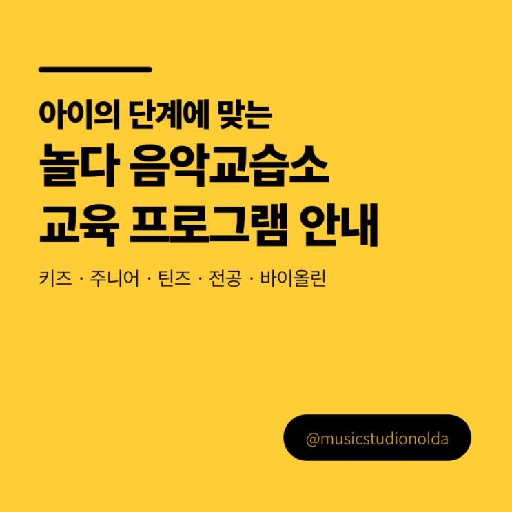 음악 교육 프로그램 안내 놀다 키즈 | 5–7세 ✔️음악과 친해지는 첫 단계 소리, 리듬, 움직임을 통해 음악을 자연스럽게 경험하는 시기입니다. 놀이 중심의 수업으로 집중력과 음악적 감각을 기초부터 형성합니다! 놀다 주니어 | 초등부 ✔️기초부터 탄탄한 실기 교육 악기 연주에 필요한 기본기를 체계적으로 다지는 단계입니다. 개별 속도에 맞춰 기초 테크닉과 악보 읽기 및 올바른 연습 습관을 형성하여 오래 오래 좋은 취미로 즐기도록 도와줍니다! 놀다 틴즈 | 중·고등부 ✔️스트레스 해소와 정서 케어 취미 학업 부담이 큰 시기인 만큼, 음악을 통해 정서적 안정과 자기만의 시간을 가질 수 있도록 돕습니다! 취미 중....... <img src="https://blogthumb.pstatic.net/MjAyNjAxMDlfMTM0/MDAxNzY3OTI4ODI5MTA5.C_qfyLpz-nRdVxz1iIxGzwQ0Ef5e7QMrxEzjINTPYPIg.mJYEWryBlgOVHEIZcQLq9xv3YxbVf9abL255dVcl36og.PNG/900%A3%DF1%A3%DF20260109%A3%DF121639%A3%DF0000.png?type=s3" />