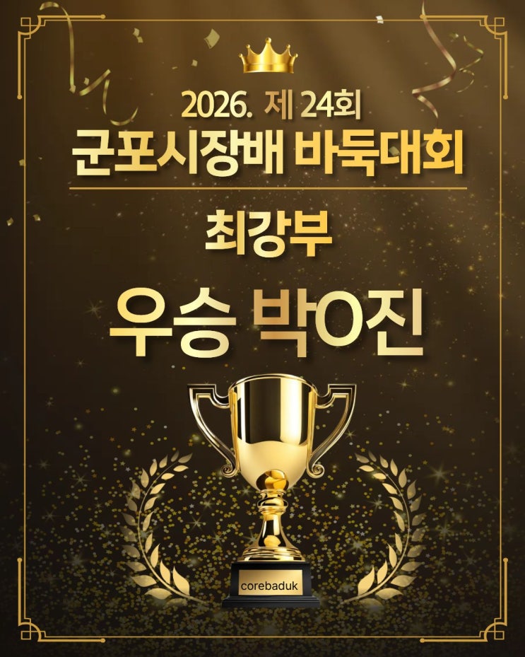 안녕하세요, 코어바둑학원 부원장입니다. 지난 토요일, 우리 코어의 꿈나무들이 [제24회 군포시장배 바둑대회]에 출전했습니다. 원장님과 아이들이 대회장으로 향하는 뒷모습을 보며 저도 수업 내내 마음으로 간절히 응원했는데요. 이번 대회에는 저희 학원에서 약 30명의 아이들이 참가했고, 그 중 20여명의 친구들이 값진 수상을 거두었습니다. 현장에서 전해온 생생한 기록들을 부모님들과 공유합니다. 코어바둑 '명예의 전당' - 수상을 축하합니다! 한 명 한 명의 이름이 새겨진 이 결과물은 아이들이 바둑판 앞에서 스스로 고민하고 인내하며 얻어낸 소중한 훈장입니다. 용기내어 도전한 모든 코어 친구들 정말 고생 많....... <img src="https://blogthumb.pstatic.net/MjAyNjAzMTdfMTUw/MDAxNzczNzIzNTI5MTkw.xGo--_MWMgLiX9yH5A-C7nXAfQ-Hawu_U7BGuI8J2V0g.ufLyQKUhi_w0Ky51Pr35cE-AlZMsOpr-76DRPlv7tJwg.JPEG/KakaoTalk_20260317_134551820.jpg?type=s3" />