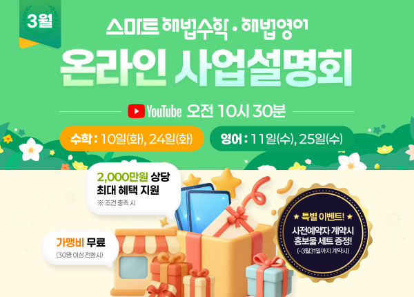“지금 아니면 끝”... 학원·공부방 브랜드 전환 창업 한정 파격 혜택 3월 종료 [한국강사신문 장지용 기자] 국내 1위 교육 프랜차이즈 천재교과서 스마트해법이 수학·영어 학원 및 공부방 창업을 희망하는 원장들을 대상으로 2026년 3월 사업설명회를 개최한다. 특히, 이번 설명회는 2026년 단 3개월만 한시적으로 운영되는 브랜드 전환 최대 2,000만원 지원 프로모션이 3월 종료를 앞두고 진행되는 마지막 사업설명회라는 점에서 큰 관심을 모으고 있다. 3월 사업설명회는 스마트해법수학은 3월 10일(화), 24일(화), 스마트해법영어는 3월 11일(수), 25일(수) 과목별로 나뉘어 월 2회씩 진행되며, 스마트해법 공식 홈페이지를 통해 참석 신청이....... <img src="https://blogthumb.pstatic.net/MjAyNjAzMDVfMTc1/MDAxNzcyNjY3NzQ3MDg3.dRyASvU49evu5DG0bQUF-IQw7JU9myoJrDEWbnechG4g.1foz7IR7Q_TY_cprudcWKiuAxmsGx2LCrSO1LlWGrd8g.PNG/PR%B1%E2%BB%E7_FC%BB%E7%BE%F7%BC%B3%B8%ED%C8%B8_3%BF%F9_%28%C5%EB%C7%D5%B9%F6%C0%FC%29.png?type=s3" />