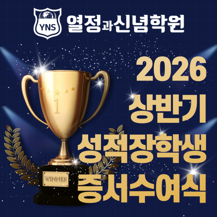 좋은 학생, 더 좋게 이끄는 HYPER PLUS 영어학원 YNS 열정과신념에서는 학교 성적을 성실하게 관리한 학생들에게 장학혜택을 줌으로써 학습에 대한 동기와 의욕을 더욱 강화하고 있습니다. 아래 학생들은 2026년 상반기 YNS 성적우수 장학생으로 선정되어 3~6개월간 자격이 지속됩니다. 힘든 노력에 대한 귀중한 결과이니 가정에서도 크게 칭찬해주시고, 다른 친구들도 동기부여가 되도록 해주세요. YNS는 여러분들의 작은 성취라도 절대로 가벼이 여기지 않겠습니다. *장학증서 수여식은 3월 셋째 주에 진행되었습니다~!^^ 모두 축하합니다! [ YNS 열정과 신념 성적장학제도 안내 ] YNS 열정과 신념에서는 성적이 우수한 학생들에게 장학혜택을....... <img src="https://blogthumb.pstatic.net/MjAyNjAzMTdfMjUx/MDAxNzczNzQzNzA3Nzc5.yM06YYtV7SL4oTmE32DA9WSjdc8wdgm3QVPZOD2YE98g.lJiytXbvcEkdDiuFHJDrVYlziaKDiIG9duXw47i9d_Yg.PNG/%BC%BA%C0%FB%C0%E5%C7%D0%BB%FD%BB%FD-001_%281%29.png?type=s3" />