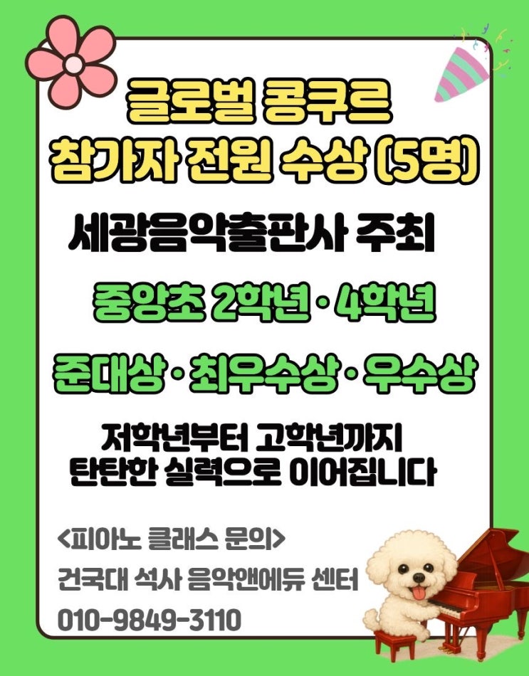 글로벌 콩쿠르 전원 수상 + 교내 합창단 합격 결과로 증명하는 음악교육 안녕하세요 건국대 석사 음악앤에듀 센터입니다. 최근 저희 센터 학생들이 좋은 결과들을 만들어냈습니다. 1. 글로벌 콩쿠르 전원 수상 (5명) – 세광음악출판사 주최 – ✔ 중앙초 2학년 · 4학년 ✔ 준대상 · 최우수상 · 우수상 참가자 전원 수상 2. 교내 합창단 합격 ✔ 초등학교 4학년 ✔ 교내 합창단 합격 학교 오디션에서도 실력 인정 이 두 결과는 단순한 ‘우연’이 아니라 ✔ 기초부터 탄탄하게 쌓는 수업 ✔ 아이별 맞춤 지도 ✔ 음악을 이해하는 교육 의 결과입니다. 저학년부터 고학년까지 탄탄한 실력으로 이어집니다 저희....... <img src="https://blogthumb.pstatic.net/MjAyNjAzMTlfMTU3/MDAxNzczOTE2OTkxNDc5.zcZFLUBXLFwpJNrnGVvtEYLxIG1jD2NtbdzkiptUBmcg.JAyM2odkRHqK6ZDDDU8exUHUBbykD_R1MBN2v7wTu6wg.JPEG/IMG%A3%DF1414.JPG?type=s3" />