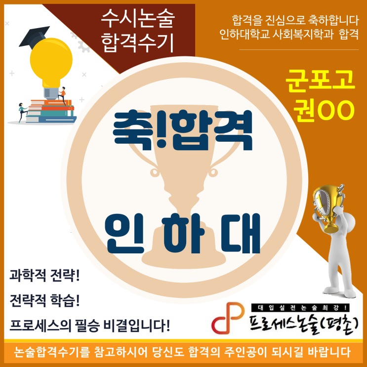 군포고 권OO 인하대학교 사회복지학과 합격수기 안녕하세요. 저는 인하대학교 사회복지학과에 논술전형으로 합격하게 된 권OO입니다. 저는 고등학교 생활을 하며 정시, 수시 준비를 제대로 하지 못한 채 고3을 맞이하여 불안한 마음으로 수능을 치고 결국 재수를 하게 되었습니다. 그렇게 재수 생활을 하던 중 친구로부터 논술 전형에 대한 이야기를 듣게 되었고 제 부족한 성적을 만회하고자 논술 공부를 시작하게 되었습니다. 논술 수업을 처음 들었을 때는 논술 문제의 요구사항에 알맞는 답을 하지 못하고 제 생각만 이야기하는 등 여러 문제를 겪었습니다. 그러나 이성렬 선생님의 정규반 수업, 이정연 선생님께서 해주신 인하대 파이널 클....... <img src="https://blogthumb.pstatic.net/MjAyNjAzMjBfMjQ5/MDAxNzczOTg5MjAwNjQw.u9PNPH1iEnWmen08Rv2Ti9rtc6cd4mMCfIpIlleIJzEg.YkuuA8Wi8A_OVXWQ-8xgleUpLRJcBRTlIFnhDSWXSuwg.PNG/2026_%B1%C7%BF%EC%C1%F8%28%B1%BA%C6%F7%B0%ED%29_%C7%D5%B0%DD%BC%F6%B1%E2.png?type=s3" />