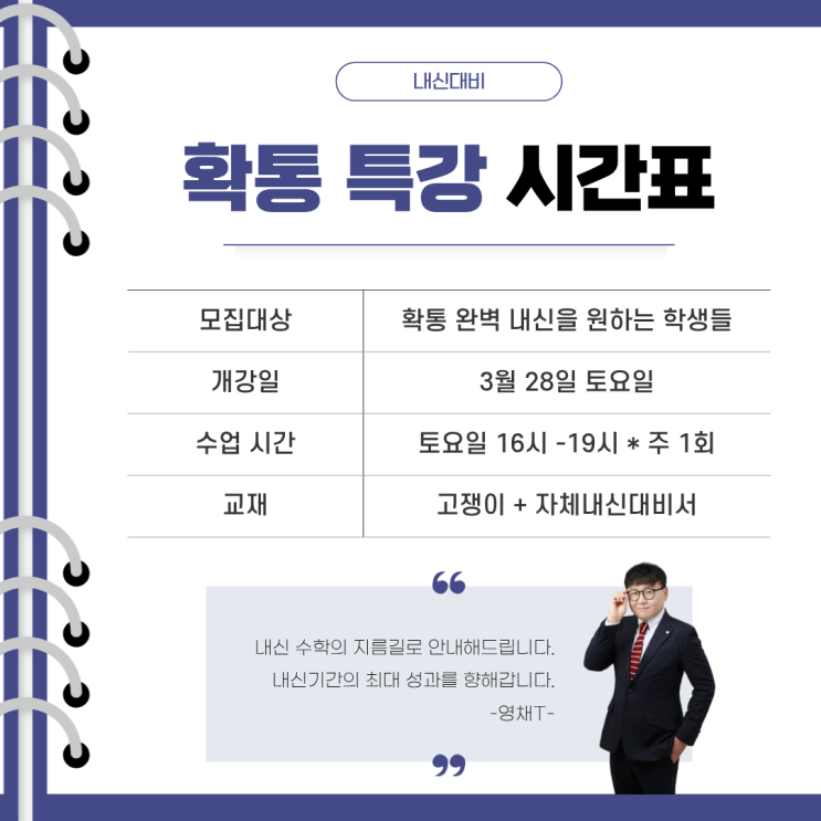 안녕하세요. 원리와 해석 수학학원입니다. 확통과 기하는 수학 내신에서 꾸준히 성적 차이를 만드는 선택과목입니다. 문제를 많이 푸는 것보다 개념의 원리를 정확히 이해하는 것이 더 중요한 과목입니다. 개념이 정리되지 않으면 유형이 조금만 달라져도 점수를 놓치기 쉽습니다. 그래서 저희는 내신 완성으로 이어지는 체계적인 수업으로 확통·기하 내신대비를 준비합니다. 내신대비 확률과 통계 수업 안내 개강 - 2026년 3월 28일 토요일 수업 시간 - 매주 토요일 16:00 - 19:00 학습 기간 - 3월 넷째 주 ~ 중간고사까지 교재 - 고쟁이 + 자체 제작 내신 대비서 수업 구성 - 주 1회, 3시간 담임 수업 + 질의응답....... <img src="https://blogthumb.pstatic.net/MjAyNjAzMDZfMTgw/MDAxNzcyODAxNzc4MzM3.kzG4qyotQLwk9AFbRsvk1y7eQbjaRdo6RxogmJcOmsYg.OtpYV7HbXJNGAq4DjpydT0na6tXkdWmB3d7hiftC7DAg.PNG/2.png?type=s3" />