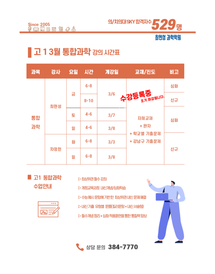 최현성과학학원은 의대, 치의대, SKY 등 최상위권 대학 수험생을 위해 전문적으로 과학 관련 내신과 수능 대비 강의를 제공하는 학원입니다. 특히 고등학생을 대상으로 물리, 화학, 생명과학, 통합과학 강의를 개설하며, 중간고사와 기말고사 대비는 물론 심화 학습과 수능 기출 문제 풀이까지 체계적으로 지원합니다. 학원의 주요 특징은 다음과 같습니다. 1. 강사진과 강의 방식 - 물리학/ 화학/통합과학은 최현성 원장이 직접 강의하며, 생명과학/통합과학 차정헌 샘이 담당합니다. - 수업은 PPT와 분필 판서식을 병행하는 방식이며, 강의 동영상은 제공하지 않습니다. 2. 커리큘럼과 시간표 - 3월 초부터 시작하는 중간고사 대비 및 심화 강....... <img src="https://blogthumb.pstatic.net/MjAyNjAyMTFfMjUy/MDAxNzcwODEwMzgwMzU3.u4UTAUjN9bGVCCRMNwglqbK044x1xU-Ej-5wkskeA24g.NkLgs_ErelfORck-pOTW-BtLEw4hpR_74b1k7Qez2oQg.PNG/%BD%BD%B6%F3%C0%CC%B5%E51.PNG?type=s3" />
