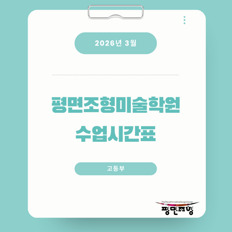 어느덧 추운 겨울이 지나고 따뜻한 봄바람과 함께 새로운 학기가 시작되었습니다. 설레는 3월, 우리 평면조형 친구들도 새로운 마음가짐으로 그림을 시작할 수 있도록 학원 수업 시간을 공지합니다. 아래 내용을 참고하시어 수업 일정에 차질 없으시길 바랍니다. 고등부(입시) 수업 시간 목요일 ~ 금요일: 18:30 ~ 22:00 (총 3시간 30분 수업) 토요일 ~ 일요일: 10:00 ~ 18:00 (총 7시간 수업) *(주 5회 수업, 요일 및 시간 선택 가능) 고등부(예비) 수업 시간 목요일 ~ 금요일: 18:00 ~ 22:00 (총 3시간 30분 수업, 쉬는시간포함) 토요일 ~ 일요일: 10:00 ~ 18:00 (총 7시간 수업) *(고1 주 3회 수업,고2 주4회 수업, 요일 및 시간 선택 가능) 3....... <img src="https://blogthumb.pstatic.net/MjAyNjAzMDNfMjIw/MDAxNzcyNTMxNTI4MTA1.rWTighc2ZGsruXmEZqTPepwvAEJZuOIiRiX4-SosBKgg.xOEU0tRW6a079vyuGp-H6r4Tsuf7qrWgMZjobEMF0Q4g.PNG/2026%B3%E2_3%BF%F9_%281%29.png?type=s3" />