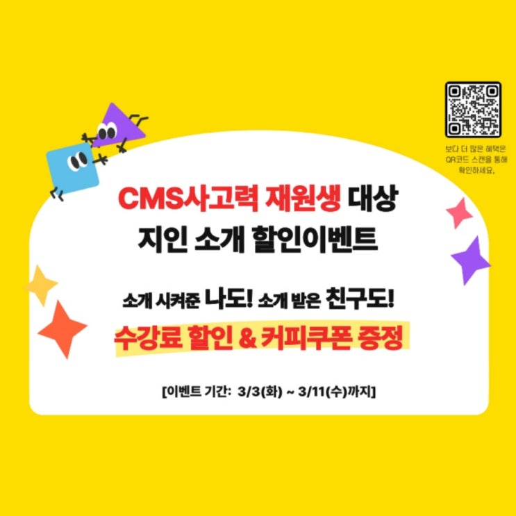 안녕하세요! 평촌CMS 사고력수학관입니다. 새 학기를 맞아, CMS사고력관을 믿고 보내주시는 학부모님들께 감사한 마음을 담아 지인 소개 이벤트를 준비했습니다. 소개 시켜준 나도! 소개 받은 친구도! 모두 혜택을 누릴 수 있는 지인 소개 할인 이벤트! 지금 바로 확인해 보세요. ️ 이벤트 기간 2026년 3월 3일(화) ~ 3월 11일(수)까지 (단 9일간 진행되니 기간을 꼭 확인해 주세요!) 풍성한 혜택 안내 이번 이벤트는 두 가지 단계로 혜택을 드립니다! 1. 입학고사 응시만 해도? 혜택: 메가커피 쿠폰 증정 ☕ 대상: 소개받은 친구가 입학고사에 응시할 경우 응시 기간: ~ 3월 14일(토)까지 쿠폰 발송: 4월 둘째 주 일괄 발송 예정....... <img src="https://blogthumb.pstatic.net/MjAyNjAzMDNfMTY2/MDAxNzcyNTE0MzkzMTYw.oEMNskkzduFluIMnxoUYxX0ILHeprElYOCWLQZJxOTsg.DDnQkx_uLd9yMeCg1l_-tjK5GKv5aUXM-khg71dT2hMg.JPEG/%C1%A6%B8%F1%C0%BB-%C0%D4%B7%C2%C7%D8%C1%D6%BC%BC%BF%E4_-001_%286%29.jpg?type=s3" />