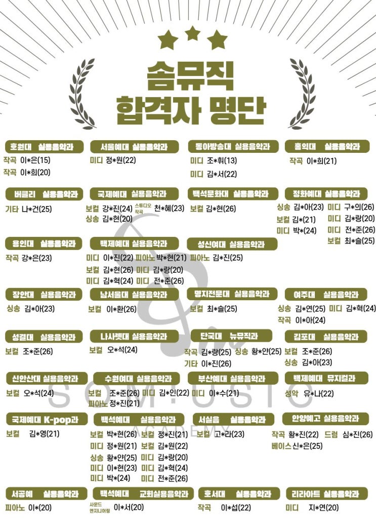 솜뮤직 실용음악학교 예고/대입 합격자 명단