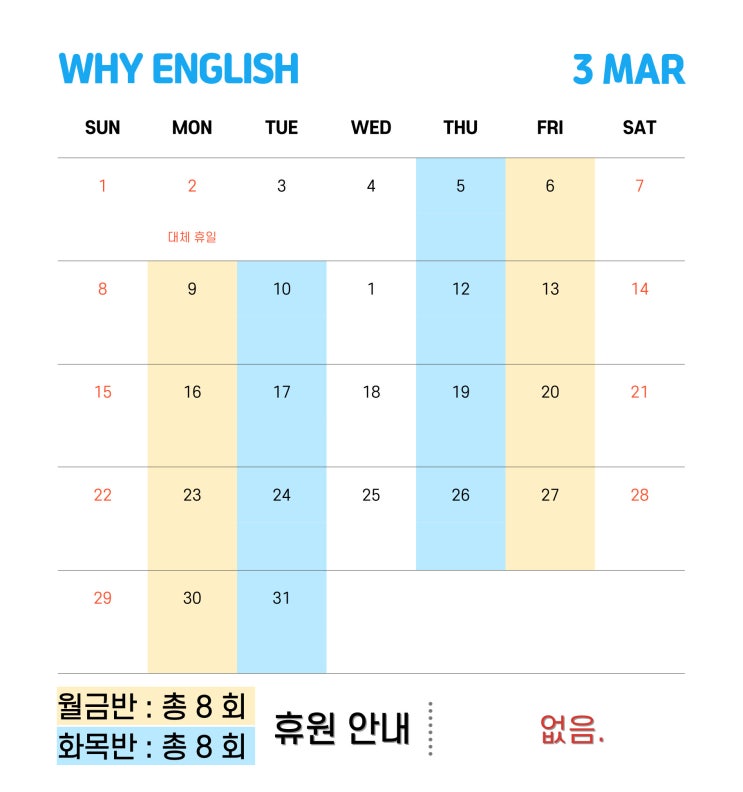 3월 수업 일정입니다. 감사합니다 :) <img src="https://blogthumb.pstatic.net/MjAyNjAzMDNfMjcg/MDAxNzcyNDk2OTE0MjI3.a5NEViPv23D-R1lqRqR_5-bEIosOeeuTx2h4v21MrSog.O4w1SjlJUlgxjNN90uDhN633VKivfyKi35n9Tewdhvgg.JPEG/2026_3%BF%F9%C0%CF%C1%A4-003.jpg?type=s3" />