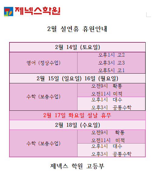 관양동 제넥스 학원 설 연휴 휴무 안내