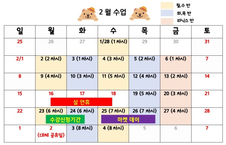 안녕하세요, 링키영어 관악타운 Elsa입니다^^ 이제 설 연휴를 앞두고 우리 링키즈들과 슬슬 마켓데이 이야기를 나누고 있어요~ 링키즈들은 그동안 열심히 모았던 링키 쿠폰으로 왕창 살거라는 확신의 다짐을 하고 있답니다~ 그럼 2월 수업은 어떻게 진행되고 있는지 알려드려요~ 월수반은 1월 28일(수), 화목반은 2월 3일(화)에 1차시가 진행되었고, 설 연휴와 대체 공휴일까지 있어서 3월 초까지 2월 수업은 진행될 예정입니다~ 그리고 3월 수업에 문의가 많으신데요~ 월수반은 3월 9일(월), 화목반은 3월 5일(목)이 1차시이니 참고부탁드립니다^^ 2월에도 해피 링키 타임~♡ 놀이 영어? 아니죠~! 즐거운 영어 학습이 자연스럽게 이루어지는 곳....... <img src="https://blogthumb.pstatic.net/MjAyNjAyMTJfNjAg/MDAxNzcwODU3NTM3NDQx.gKizRIeYAylkdERGr77_Jdnu96bce_SMiD0ljVA5dSog.TmROS7BdKsAwr44vwikQqmPN3cW1B-LUX47CodhlMlUg.JPEG/%C8%AD%B8%E9_%C4%B8%C3%B3_2026-02-12_095151.jpg?type=s3" />