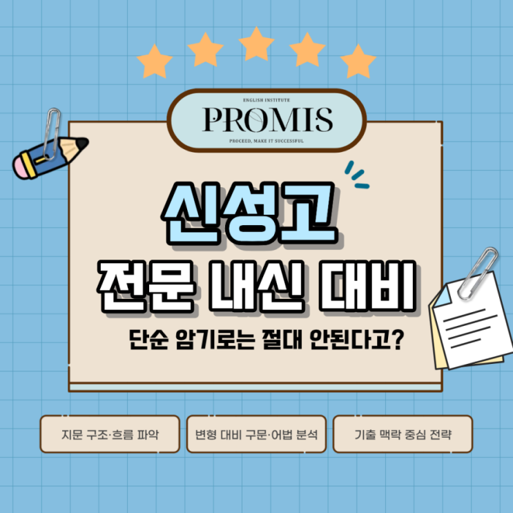 안녕하세요,PROMIS 영어학원 입니다! 신성고 영어 내신을 준비하는 학생·학부모님이라면 이미 한 번쯤은 느끼셨을 건데요 “분명히 외웠는데, 시험장에서 처음 보는 문제 같아요…” 그 이유는 시험 출제 방식 자체가 다르기 때문입니다! ◎ 신성고 영어 내신 시험 경향 분석 ① 순수 어휘 문제 – “대표 단어만 보면 망합니다” 단어 뜻만 묻는 문제가 아닙니다 부스터 보카의 예문 전체를 활용합니다 문장 속 쓰임, 뉘앙스, 문맥 판단까지 요구합니다 ⇒ 단순 단어장 암기로는 절대 대응 불가 ② 시험 범위가 많습니다 교과서 1과 + 부교재 4회 분 범위 자체가 넓어 “대충 외우고 찍기 전략”이 통하지 않습니다 ③ 지문 변형이 매우 많습니....... <img src="https://blogthumb.pstatic.net/MjAyNjAyMTNfMjky/MDAxNzcwOTc2MzYyNjkx.uYi0D5B7tYz5cRdsOK9KY9f9mCOsIjQr_TzI04K0Zm0g.SdeeraDpcCA6yqYqMH9PhquMooVxYILnPFzuLxSJFdsg.PNG/image.png?type=s3" />
