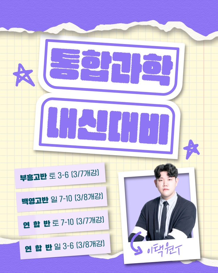 < 통합과학 / 이택원T - 시간표 > ♥ 부흥고반 : 토 3-6 (3/7 개강) ♥ 백영고반 : 일 7-10 (3/8 개강) ♥ 연합반 : 토 7-10 (3/7 개강) ★마감임박 ♥ 연합반 : 일 3-6 (3/8 개강) 연합반이라고 해서, 우리 학교에 맞는 자료와 피드백을 제대로 받지 못하는것 아닌가? 그렇지 않습니다. 평촌 통합과학, 이택원T 수업은 각 학교별 부교재 및 자료들을 전격 수집하여 해당학교에 맞는 자료와 문제풀이, 그에 맞는 피드백까지 진행합니다. ▶ 각 학교 선생님 수업 필기 분석 ▶ 해당 학교 기출 전격 해부 ▶ 각 학교별 물화생지 전 영역 고난도 문제까지 대비 이런 학생들에게 이 수업을 추천해요~! ★ 고등대비가 불안한 학생 ★ 첫 시험부....... <img src="https://blogthumb.pstatic.net/MjAyNjAyMTRfMjQ3/MDAxNzcxMDY0MzUzNTYy.RF1t3Q-NKd4BJHslc-795cEXrbJCBawRKWKkeiUKwkog.8lfG2LAbTpC8bM6Ygp9u-OUc_I-0Um49H1H7eFUL2gMg.JPEG/%28%C5%EB%C7%D5%B0%FA%C7%D0%293%BF%F9%B3%BB%BD%C5%B4%EB%BA%F1_%28260124%29_%B4%EB%C1%F6_1.jpg?type=s3" />