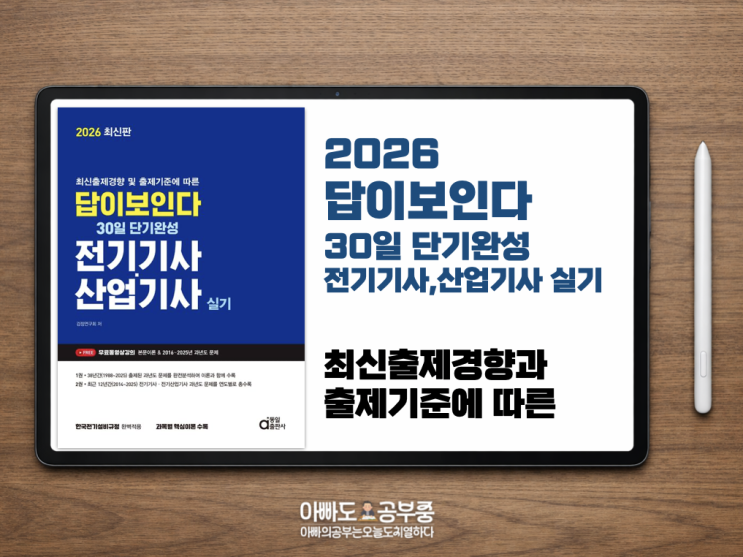 2026 답이보인다 30일 단기완성 전기기사·산업기사 실기 (최신출제경향 및 출제기준에 따른) 38년 기출문제 분석 교재 전기기사와 전기산업기사 시험에서 지난 38년간 출제된 과년도 문제를 철저하게 분석하여 실기 시험 대비에 최적화된 기출 중심 교재입니다. 출제기준 기반 문제 구성 한국산업인력공단의 출제기준에 맞춰 문제를 정리하여 실제 시험 출제 방향과 동일한 흐름으로 학습할 수 있도록 구성되었습니다. 전기설비 실무 중심 학습 전기설비 설계, 작업, 운용관리, 유지보수 및 시험점검 등 실무 중심의 전기설비 분야를 체계적으로 학습할 수 있습니다. 핵심 이론 엄선 정리 실기 시험에서 반드시 이해해야 할 핵심 개념과 주요 내....... <img src="https://blogthumb.pstatic.net/MjAyNjAzMTVfMjg0/MDAxNzczNTQ1MDg1MjIz.ea9DpDtE5qKNRH5XNumALGlxl0vblxwWTM5S0pW6YRYg.aSTgJwCUiBndsxDfzFJU10AfWI81tNZ8ng_BtldHmsog.PNG/%BD%BA%C5%A9%B8%B0%BC%A6_2026-03-15_%BF%C0%C8%C4_12.24.26.png?type=s3" />