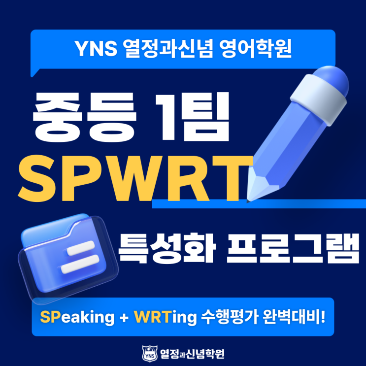 중1 특성화 프로그램 < SPWRT(스프라이트) > ! 기본 내공 충실 + 수행평가 완벽대비 + GPT & RPT & Speaking & Writing 강화 훈련 + 영역별 종합평가 실시 안녕하세요. 좋은 아이, 더 좋게 이끄는 HYPER PLUS 영어학원 YNS열정과신념 입니다. 중학교에 입학한지 벌써 1개월이 지났습니다. 중등 1학년 1년의 기간동안 지필고사는 1~2회 치러지지만, 스피킹과 라이팅이 주를 이루는 수행평가가 상시 진행되며, 이 결과가 1학년 평가의 대부분을 차지하게 됩니다. 이에 YNS 중등 1학년은 내신대비 기간 동안 스피킹과 라이팅이 강화된 YNS 특성화 프로그램 <SPWRT(스프라이트)>로 훈련받으며, 자신감 넘치는 Presentation을....... <img src="https://blogthumb.pstatic.net/MjAyNjAzMTZfMTcx/MDAxNzczNjUyNDAzNjc0.pio2tO2uL1rH3-5lywq5b_7bhLHet_vCXJvbc33dk-Ig.8urZKAUfhtX0z5Rb6s8xUGziTerotC3sEJSiE2Ylc64g.PNG/002.png?type=s3" />
