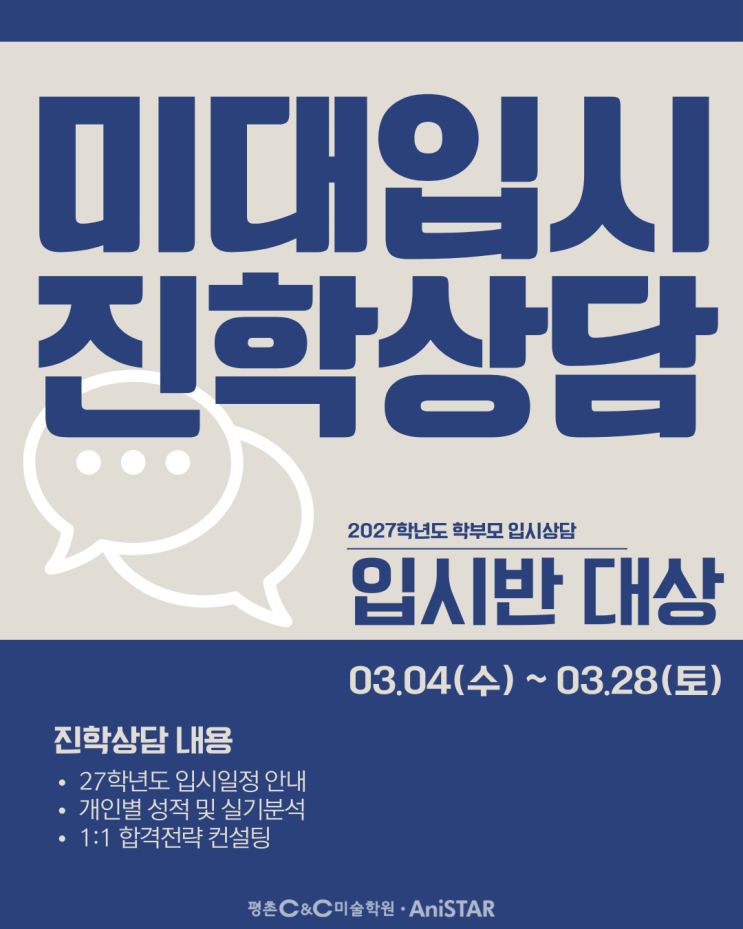 안녕하세요 평촌 미대입시학원 씨앤씨 애니스타 미술학원입니다. 이번 3월 재원생기준 학부모님 대상 미대입시 진학상담을 실시합니다. 기간은 03월04일(수) ~ 03월28일(토)까지 본 미대입시 진학상담은 평촌산본 C&C,애니스타 미술학원의 재원중인 입시반 학생의 학부모님을 대상으로, 초청 미대입시 진학상담을 진행합니다. 미대입시에 궁금하신점, 등록예정, 타학원 학생의경우 아래 연락처로 사전 예약해 주시면 친절한 상담 도와드리겠습니다. 상담안내 ⬇️ 031. 382. 7774 동안구 평촌대로 126 귀인빌딩 3층 [아래 사진을 눌러 상담예약하기] 평촌 씨앤시 애니스타는 무엇이 다른가요? 실기에서 무엇보다 중요한것은 바로 검....... <img src="https://blogthumb.pstatic.net/MjAyNjAzMDdfMTkx/MDAxNzcyODYzODUxMjMx.LSjjSSX0hFk44haJCCN9HgICSeh3kIeK1uvoWRNeX24g.FzXBB1aIkCK6DVkMSFkXVjDAIP3iMLVDIfaVCv0Wc3Ug.PNG/5.png?type=s3" />