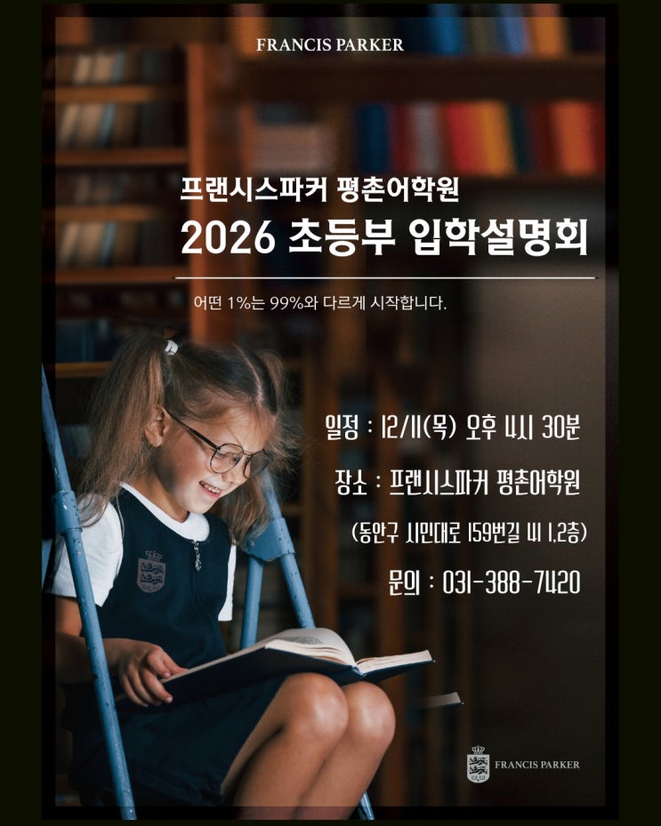 1%의 잠재력과 창의성을 계발하여 글로벌 인재로 키워 내는 영어가 즐거운 프랜시스파커 평촌어학원 입니다. 안녕하세요. 프랜시스파커 평촌어학원입니다. 2026학년도 초등부 설명회에 관심을 가져주셔서 진심으로 감사드립니다. 2026년 프랜시스파커 평촌어학원 초등부 설명회 일정 및 예약 방법을 아래와 같이 안내드립니다. 설명회는 온라인 사전 예약을 통해서만 참석이 가능합니다. 입학 설명회 참석을 희망하시는 학부모님께서는 프로필 상단 링크를 통해 구글폼 신청서를 작성해주시기 바랍니다. 설명회 일정 2025년 12월 11일(목) 오후 4시 30분 (예비 초1 ~ 초6 대상) 장소 프랜시스파커 평촌어학원 B1 FUN HOUSE (경기 안양시 동안구 시....... <img src="https://blogthumb.pstatic.net/MjAyNTExMjBfMTA0/MDAxNzYzNjA2NTE5OTk3.JntsRO0INM8-tbZikeO3ITukwwHiSjXrmuOdJxF6pQUg.qvFwutk2n_yqzgj3AI8K0Mw2zUmB9QXIblEEopMgcecg.JPEG/2026%B3%E2_FRANCIS_PARKER_PYEONGCHON_%BD%C5%C0%D4%BB%FD_%B8%F0%C1%FD%BF%E4%B0%AD_%283%29.jpg?type=s3" />