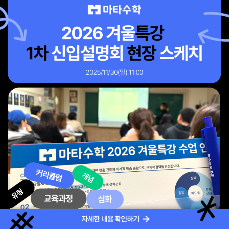 지난 11월 30일, 마타수학 2026 겨울특강 1차 신입설명회가 마타수학 교실에서 진행되었습니다. 예상보다 많은 학부모님들이 참석해, 설명회 시작 전부터 교실 대부분의 좌석이 채워진 모습이었습니다. 정확한 수학교육 정보를 확인하고자 하는 학부모님들의 관심을 현장에서 직접 느낄 수 있었습니다. 학년별 커리큘럼·교육과정 변화 집중 안내 이번 설명회에서는 · 달라진 고교과정 구조 · 초등·중등 학년별 로드맵 · 단계별 심화·응용·문제이해 프로세스 · 담임제 학습관리 시스템 등을 중심으로, 학부모님들이 가장 궁금해하시는 내용을 순서대로 안내드렸습니다. 학부모님들은 제공된 안내서에 직접 메모하며 내용을 꼼꼼히 확인하셨고, 문....... <img src="https://blogthumb.pstatic.net/MjAyNTEyMDNfMTc1/MDAxNzY0NzI2NzUxMjM1.aOL58PXkaem17cN8fQgMtSwOFoNl_-SIx9geOUVM89kg.tyWPmFUthbXBrl4jvUNkz6ffipReb-58tjo9lgenoFEg.PNG/20251130_%B8%B6%C5%B8%BC%F6%C7%D0%B0%DC%BF%EF%C6%AF%B0%AD%BD%C5%C0%D4%BC%B3%B8%ED%C8%B8%C7%F6%C0%E5%BD%BA%C4%C9%C4%A11.png?type=s3" />