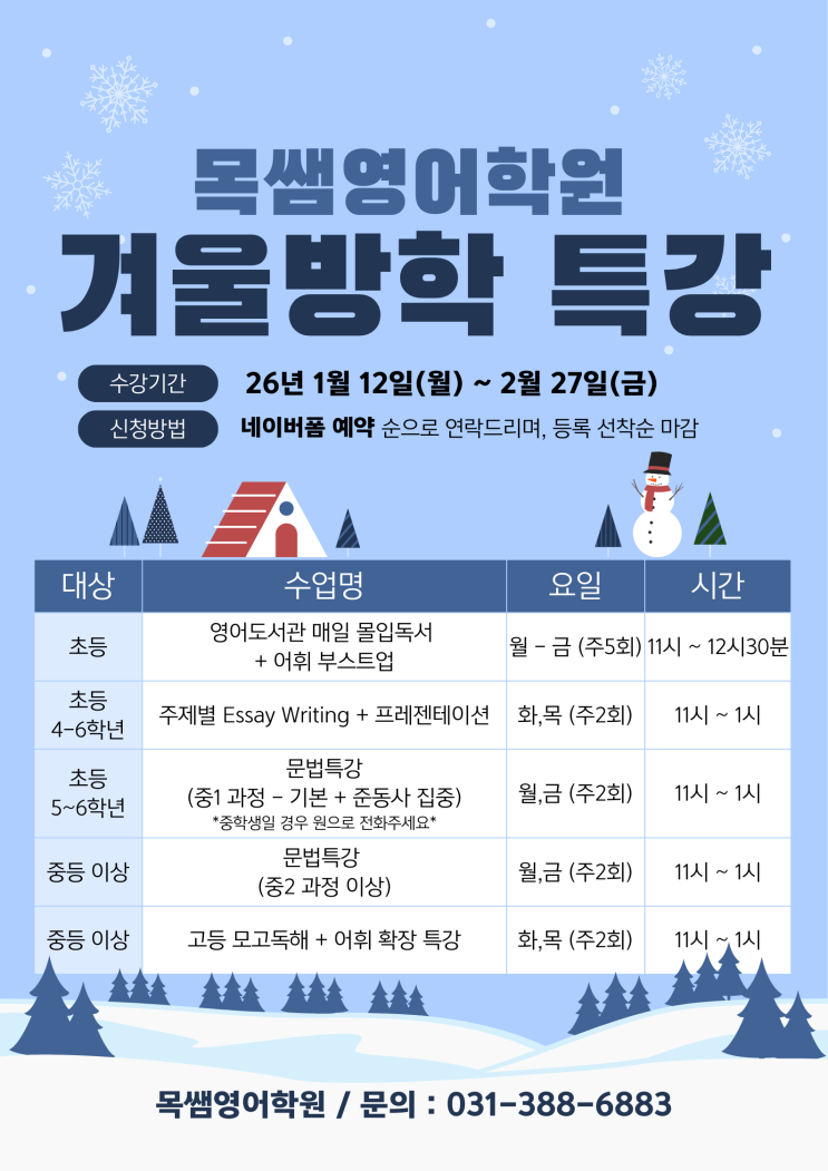 https://naver.me/xoQuGsaz ❄️ 2026 목쌤영어겨울방학 특강 26년 1월 12일(월) ~ 2월 27일(금) 네이버폼 신청 후 차례로 안내를 드리며, 안내 후 등록이 가능합니다. (선착순 마감) 겨울방학은 영어 실력이 가장 크게 성장하는 시기입니다. 이번 방학, 아이들의 학습 방향을 안정적으로 잡아주기 위한 학년별 맞춤 특강을 준비했습니다. 1. 영어도서관 몰입독서 + 어휘 부스트업 (초1 이상) 월~금 11:00–12:30 · 총 32회 방학 동안의 매일의 집중 읽기 루틴 형성 자연스러운 어휘 확장 & 독해 감각 성장 수준별 독서 프로그램으로 초등부터 안정적인 리딩 습관을 만들어주는 수업입니다. ✍️ 2. Essay Writing + 프레젠테....... <img src="https://blogthumb.pstatic.net/MjAyNTEyMDNfMjQ3/MDAxNzY0NzQxNDk2ODU4.paaf1DvboUYNztYmMIETG9q_-bdxhkC0DFB7fcy1xZ0g.lvlDGhsTAIGPFAEtQWb88DZ9JM6mp4t6xWyDEg3CG7Ig.PNG/image.png?type=s3" />