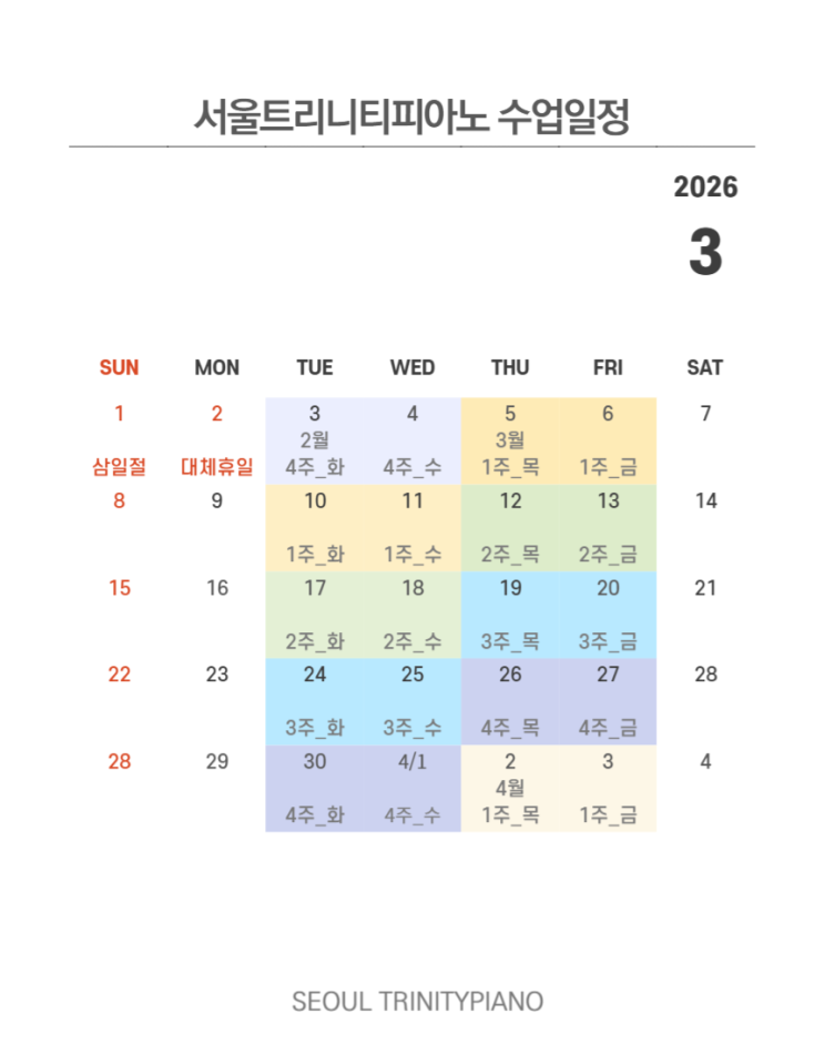 안녕하세요? 햇살이 제법 따뜻해진 요즘, 서울트리니티피아노 소식 알려드립니다:) #1. 수업일정 안내 3월 수업은 3월 5일(목) ~ 4월 1일(수)까지입니다. 3월 캘린더 첨부해드립니다. #2. 수업스케줄 관련 안내 3월 새학년 수업시간 변동으로 인해 스케줄 변경을 원하시는 경우는 카톡으로 연락주세요. #3. 3월 등록 기존수강생 등록 : 교습비 납부일은 전월 20일~25일까지입니다. 카드결제, 안양사랑페이, 계좌이체, 현금영수증, 각종증명서 발행 가능합니다. *새마을금고 9003-2652-8066-1 (서울트리니티피아노) 3월 새로운 시작, 응원하는 마음으로 피아노와 함께 즐겁게 열어가겠습니다~ ♬ “피아노 잘 가르치는” 서울트리니티피아노 <img src="https://blogthumb.pstatic.net/MjAyNjAzMDNfMTkz/MDAxNzcyNTExODIzMDAy.gcdUy5fcrrnWQubV9qYr0GVEsDXG5nR7R6VWPjzUJdsg._K_ZfWdsDhIGLsGphA3RpCj9HHTu5ROhhDMLSXw31zUg.PNG/1772511581650.png?type=s3" />