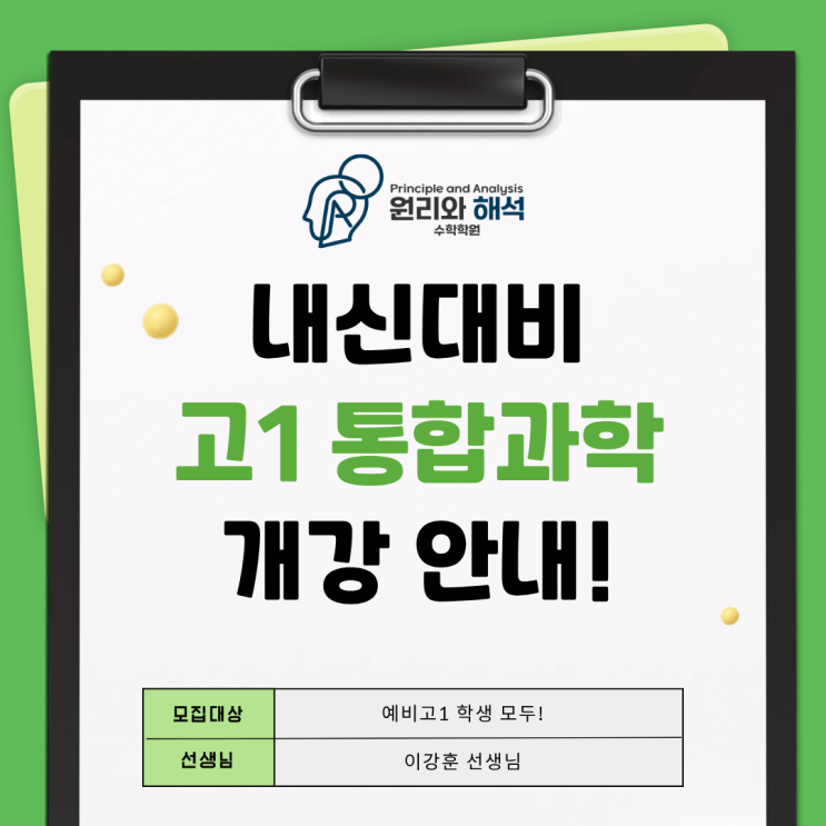 안녕하세요. 원리와 해석 수학학원입니다. 고등학교 입학 후 첫 내신, 그 시작이 곧 3년을 좌우합니다. 특히 통합과학은 고1 내신에서 중요한 핵심 과목 중 하나로, 개념 이해 없이 문제 풀이만 반복하면 등급을 안정적으로 유지하기 어렵습니다. 그래서 저희는 내신 완성으로 1등급까지 이어지는 체계적 커리큘럼으로 예비고1 학생들을 준비시킵니다. 통합과학1 내신대비 수업 안내 ✔️개강 - 2026년 3월 7일 토요일 ✔️수업 시간 - 매주 토요일 09:00 - 12:00 ✔️학습 기간 - 3월 첫 주 ~ 중간고사까지 ✔️교재 - 완자 기출픽 + 자체 제작 내신 대비서 ✔️수업 구성 - 주 1회, 3시간 담임 수업 + 질의응답 원리와 해석 수업은 주 3시....... <img src="https://blogthumb.pstatic.net/MjAyNjAzMDNfMjQ1/MDAxNzcyNTM5NzIyNzE4.UoM-y4vcp6CpX67HGQGqKjwlx89GsgjOkI2jKzwx4g8g.RZ66i0uYXWY10lOguCD5OgpjjBun4QDwfOX7lgptWT0g.PNG/1.png?type=s3" />