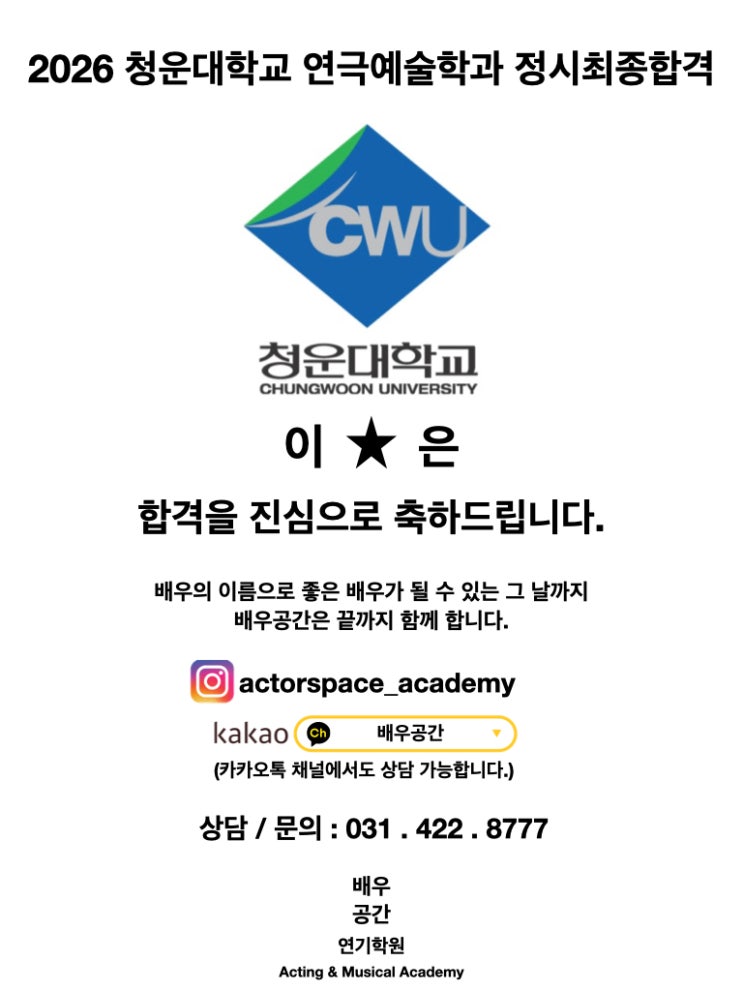 (평촌)배우공간 연기학원 대학합격 소식!!|2026청운대학교 "연극예술학과"정시 합격 #소수정예 #연기학원
