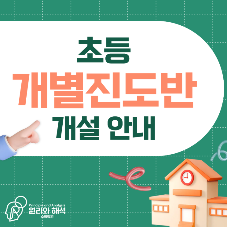 안녕하세요. 원리와 해석 수학학원입니다. 정규반 진도와 수준이 맞지 않는 아이들을 위해 부담 없이, 차근차근 학습할 수 있는 초등 개별진도반을 개설하였습니다. 개별진도반이란? 개별진도반은 정규반의 진도나 수준이 아직 맞지 않는 아이들이 각자의 현재 실력에 맞춰 학습을 진행하는 맞춤형 수업반입니다. 아이마다 이해 속도와 학습 공백이 다르기 때문에 무리하게 정규반에 맞추기보다, 필요한 개념부터 차근차근 다지는 것이 중요합니다. 개별진도반에서는 학습 진단을 통해 아이의 상태를 정확히 파악한 뒤 ✔️부족한 단원은 보완하고 ✔️필요한 진도는 집중적으로 학습하며 ✔️정규반에 자연스럽게 합류할 수 있도록 준....... <img src="https://blogthumb.pstatic.net/MjAyNjAxMDhfMTI0/MDAxNzY3ODcxNTMzNzM5.7xOpFF3adsMWWQbmPsAi51KMzOyyGdR9hwPTLspTF5Mg.ScypNFyCmTQ-wcHhfybSi4W3jdg_q1Y35k6zgRWxr94g.PNG/1.png?type=s3" />