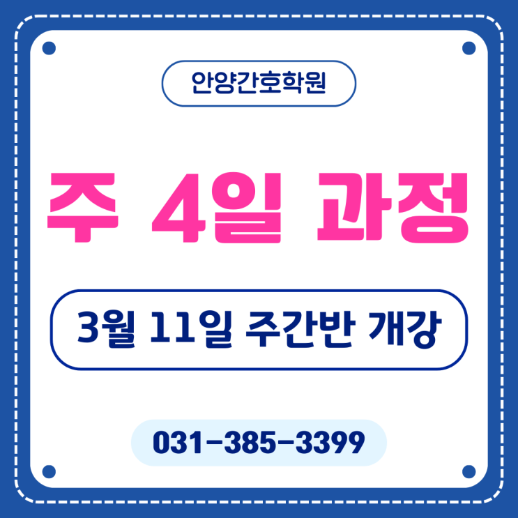 안녕하세요 안양간호학원입니다 오늘은 동안구 간호학원, 안양간호학원의 2026년 상반기 주간반 개강공지를 하려 합니다! 주 4일 과정 주간반 3월 11일 개강! 올해도 주 4일의 인기에 힘입어 2026년 상반기 또한 주 4일 과정으로 진행합니다! 주 4일 주간반은 3월 11일에 개강합니다! 주 4일 과정의 장점은 월요일부터 목요일까지 수업이 이어지고, 금요일은 휴강이라는 점인데요! 그 외에도 여름방학이 있어 수업을 듣다가 리프레시하고 돌아와 다시 또 시작할 수 있다는 점이 무척 매력적인 부분입니다! 저희 안양간호학원은 전과목 교재와 문제집을 무료로 드리고 있습니다! 그 외에도 다양한 혜택이 있으니 더 궁금한 점이 있으시다면 언제든....... <img src="https://blogthumb.pstatic.net/MjAyNjAxMTBfOSAg/MDAxNzY4MDI1NTc1NjE2.TtylaAjlqAFKz37EN2xIaGXWTmEpe0jK1YiAXi7_r2Ag.gPGq5f79FPGHqEVEriSztoG-6inZy8sc2Lwm4KPhoO4g.PNG/%BE%C8%BE%E7%B0%A3%C8%A3%C7%D0%BF%F8__%282%29.png?type=s3" />