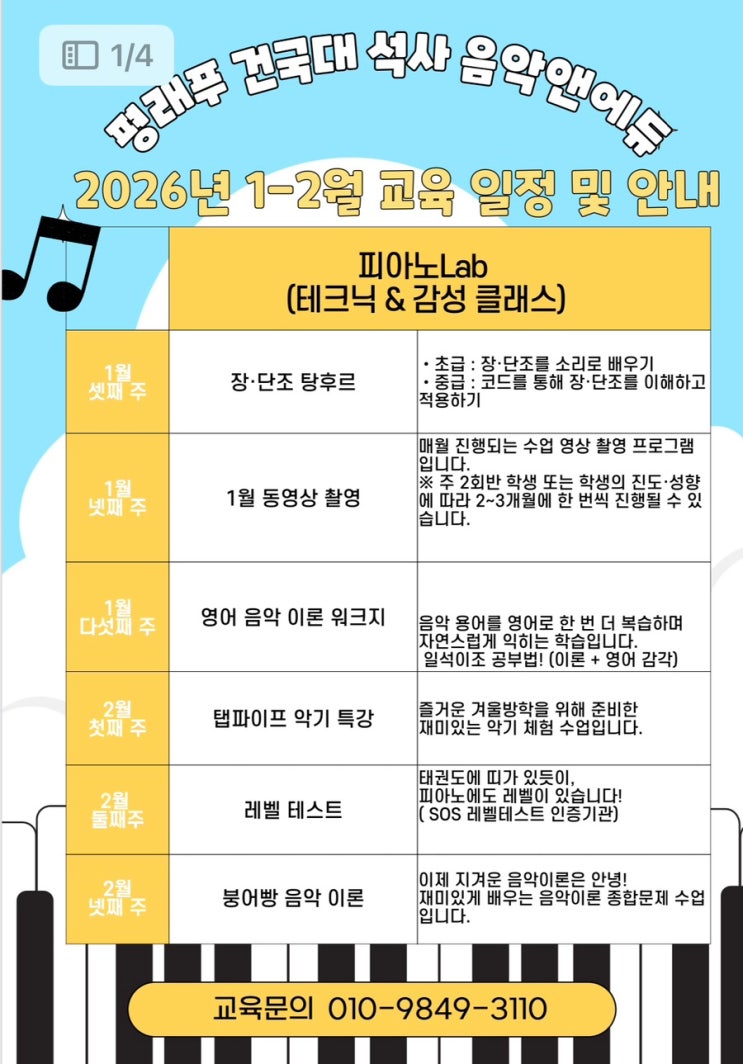 ✅ 2026년 1–2월 교육 일정 안내 안녕하세요 :) [평래푸 건국대 석사 음악앤에듀 센터]입니다✨ 1–2월에는 피아노Lab(테크닉&감성), 아트송Lab(성악·창작동요), **음악창의Lab(STEAM 원데이)**까지 아이들이 즐겁게 참여할 수 있는 다양한 프로그램을 준비했습니다! 또한 저희 센터는 웅진 AI학습 공식 제휴기관으로, 음악교육과 함께 아이의 학습 루틴과 자기주도 습관 형성도 함께 안내드립니다 ⸻ 피아노Lab (테크닉 & 감성 클래스) 1월 셋째 주 | 장·단조 탕후루 초급은 장·단조를 소리로 배우고, 중급은 코드를 통해 이해하고 적용해요! 1월 넷째 주 | 1월 동영상 촬영 매월 진행되는 수업 영상 촬....... <img src="https://blogthumb.pstatic.net/MjAyNjAxMThfMTYz/MDAxNzY4NjY2NzU0MDgw.FqQUlpFKjVE_M6Bcec3CrhP1JhurLrCKq6Gb-GxOBP4g.qRwJWoQQVZfspRPyS0tgECMfSrG_Etgz01cxbZ9ECMog.JPEG/IMG%A3%DF0476.jpg?type=s3" />