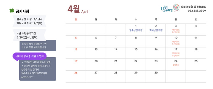 안녕하세요. 유투엠수학 옥길캠퍼스입니다. 2026년 4월 재원생 등록안내문 입니다. ★ 2026년 4월 등록안내문 ★ 1. 개강일 월수금반 : 4/1(수) 화목금반 : 4/2(목) 2. 결석 보강 안내 개인 사정으로 인한 결석(캠핑, 여행 등)은 보강 없이 과제로 대체됩니다. 그 외 결석 보강은 월 2회로 횟수를 제한하며, 횟수를 초과하는 결석은 과제로 대체됩니다. (보강 결석에 대한 추가 보강은 없습니다.) (차량이용하는 학생은 결석, 지각, 개별하원 등 꼭 차량에 전달해주세요.) 3. 숙제 안내 -모든 숙제는 100%완료를 원칙으로 합니다. -숙제 미완료 시 당일 수업 후 남아서 완료하고 갈 수 있도록 지도하겠습니다. (이 경우 개별 하원 입니다.) -풀이....... <img src="https://blogthumb.pstatic.net/MjAyNjAzMTlfNTIg/MDAxNzczODk2OTM0NTUy.nmlJWyqQgwBJvNAO50DxRVWPR9H-eWUkfVuzX5OgKMcg.UjUhMf8Une6fo43xjjGElRF9yOPSfYBW8I3paZzWQ9cg.JPEG/%BF%F9%BA%B0-%B0%F8%C1%F6%BB%E7%C7%D7-004.jpg?type=s3" />